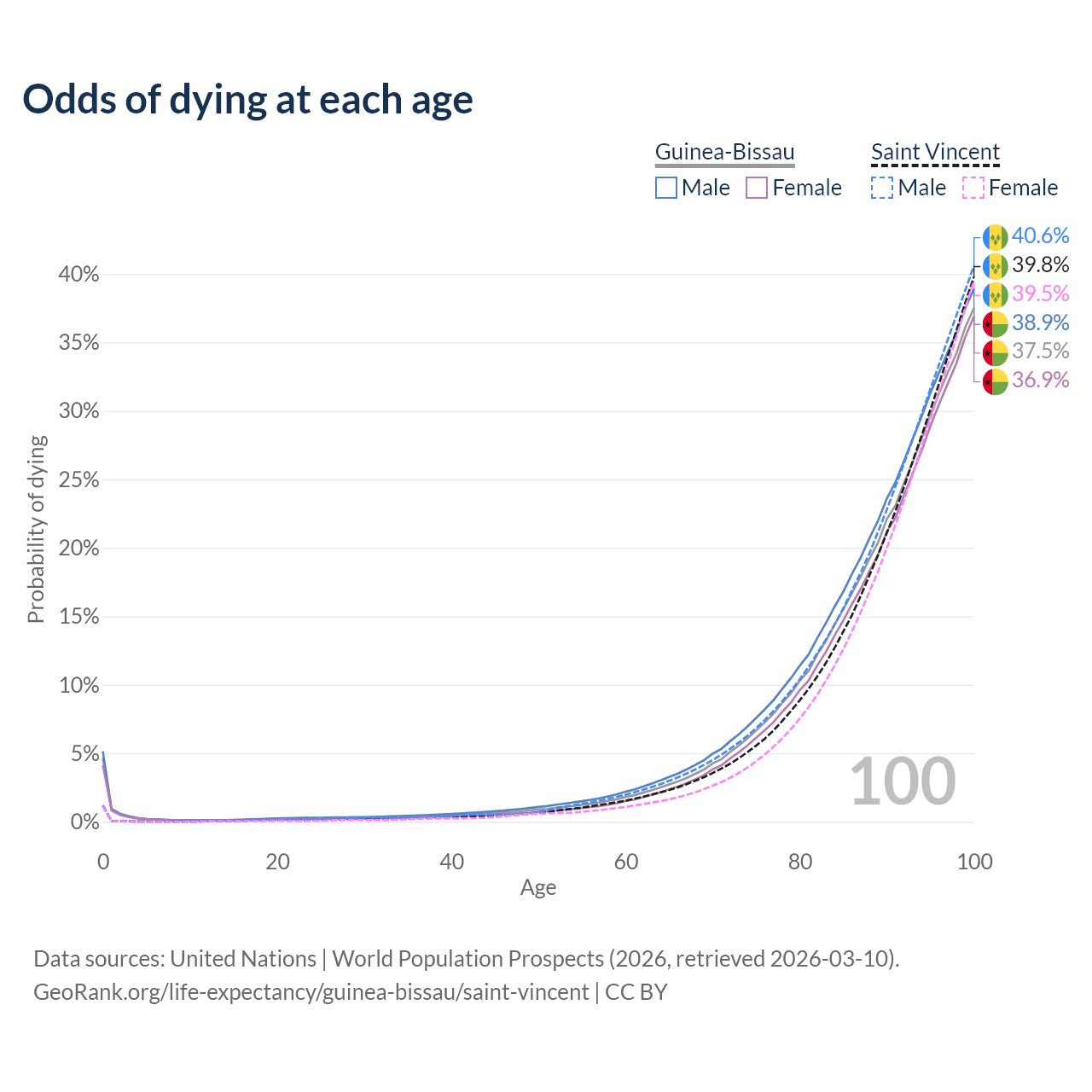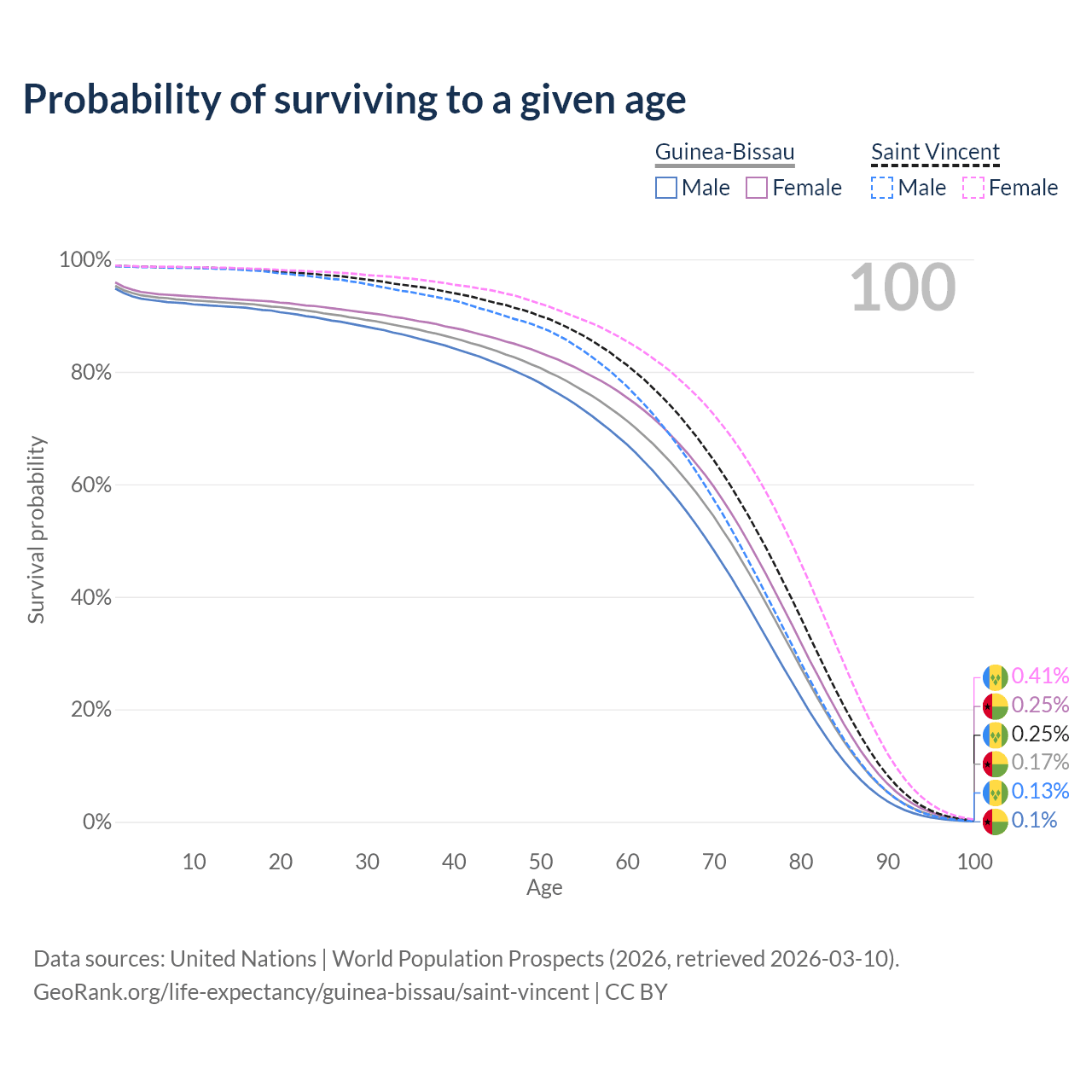 This life expectancy calculator shows the odds of living to 100, 95, 90, and below based on current age for both males and females in Guinea-Bissau and Saint Vincent, along with mean and median age of death. The calculations are based on the 2026 life tables (actuarial tables) from the UN World Population Prospects.