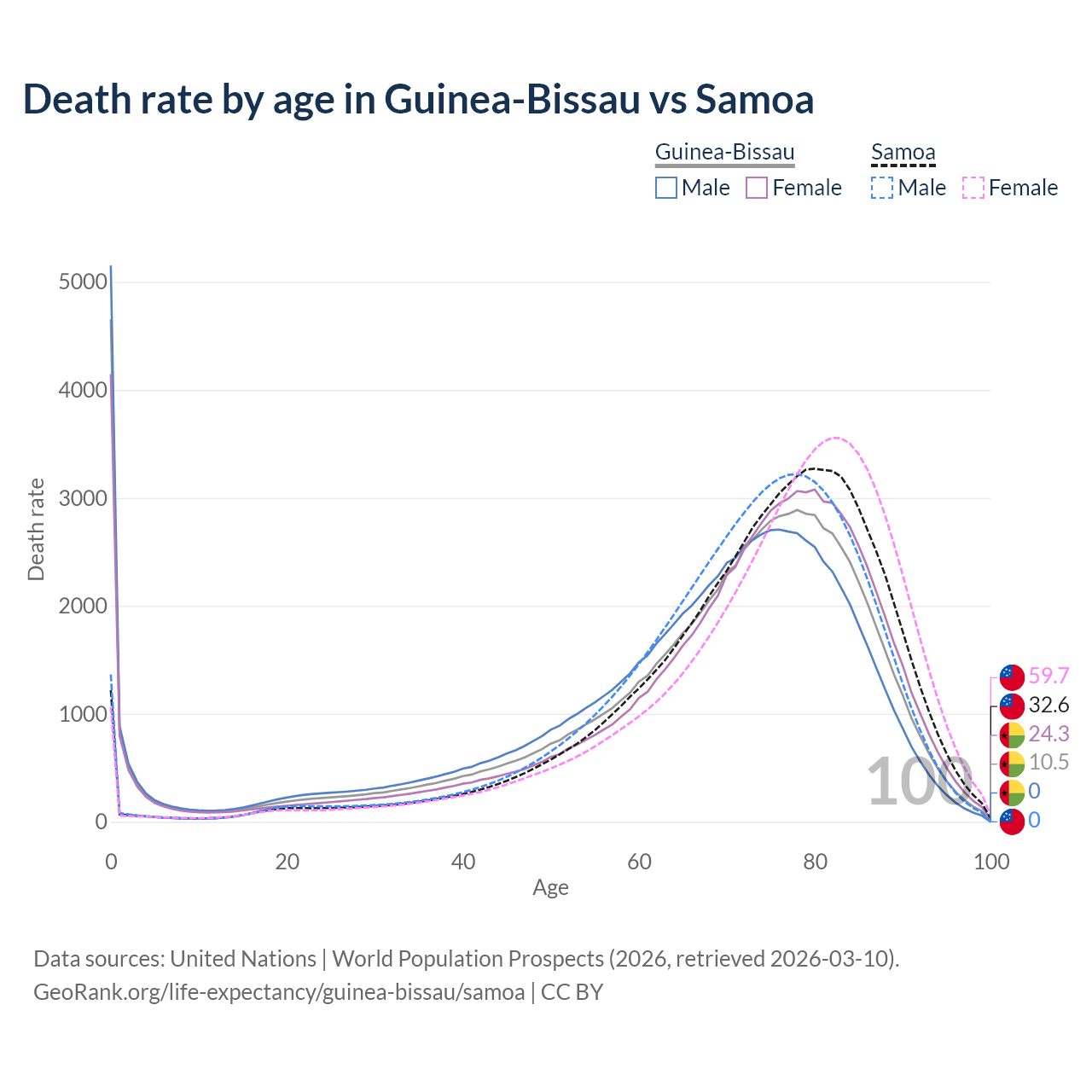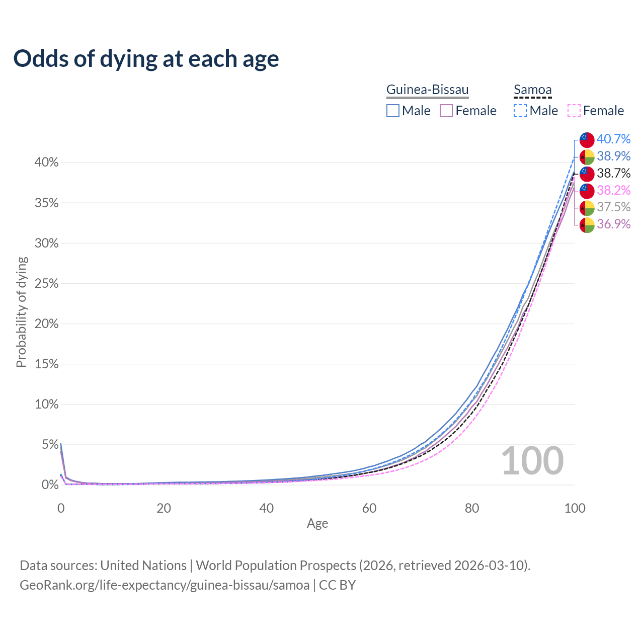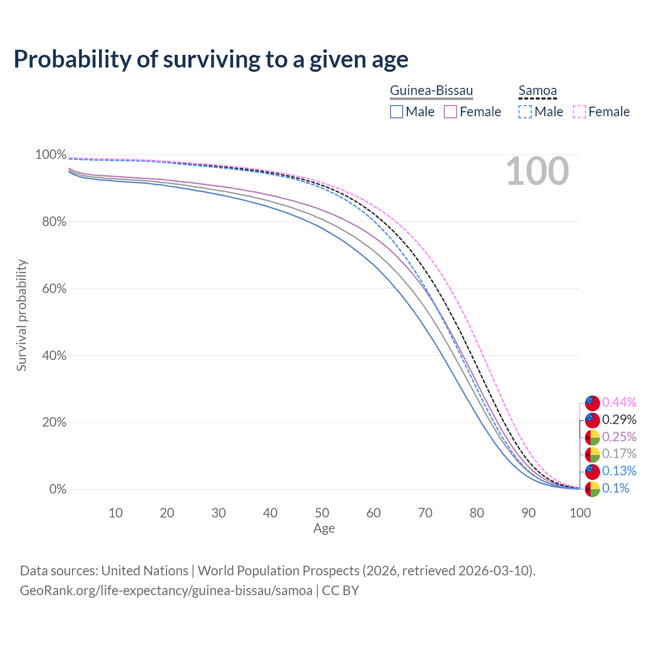 This life expectancy calculator shows the odds of living to 100, 95, 90, and below based on current age for both males and females in Guinea-Bissau and Samoa, along with mean and median age of death. The calculations are based on the 2026 life tables (actuarial tables) from the UN World Population Prospects.
