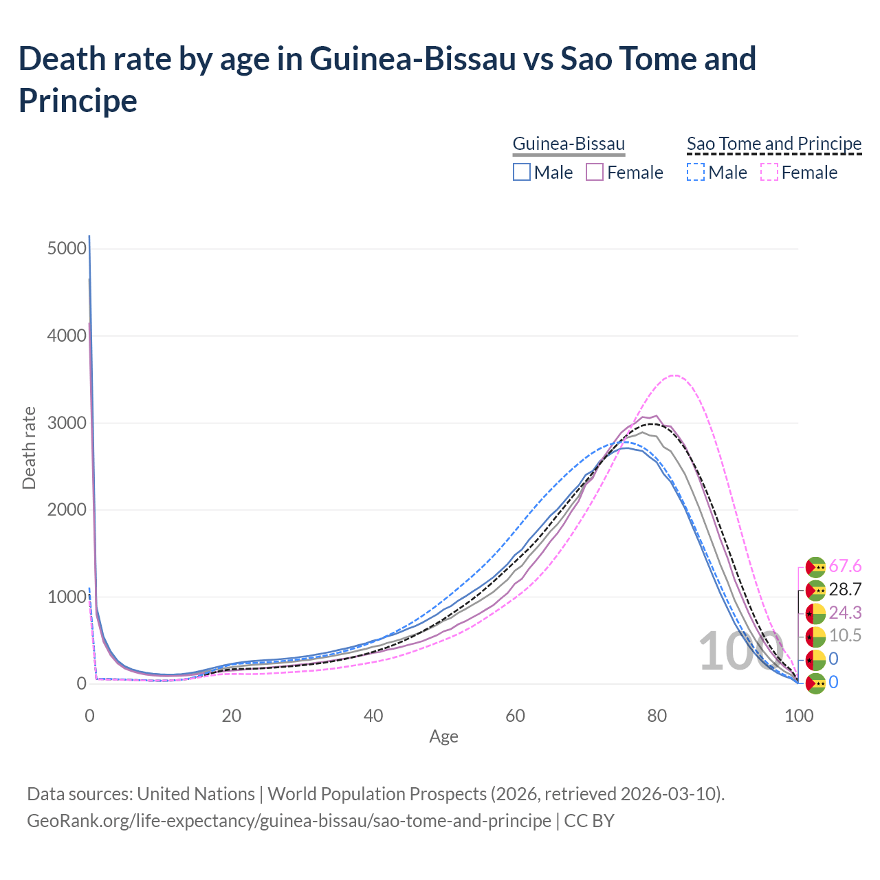 In Guinea-Bissau, the most common age of death is 0, compared to 79 in Sao Tome and Principe. The median age of death is 71.8 in Guinea-Bissau and 74.1 in Sao Tome and Principe, meaning only half of each cohort is expected to live past that age.
