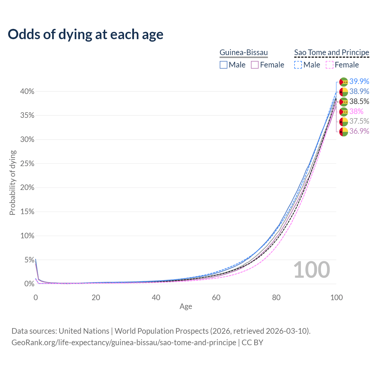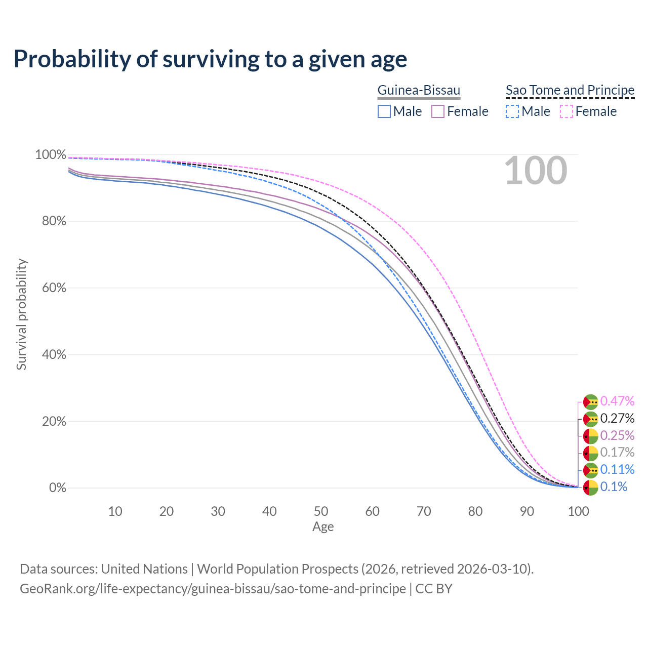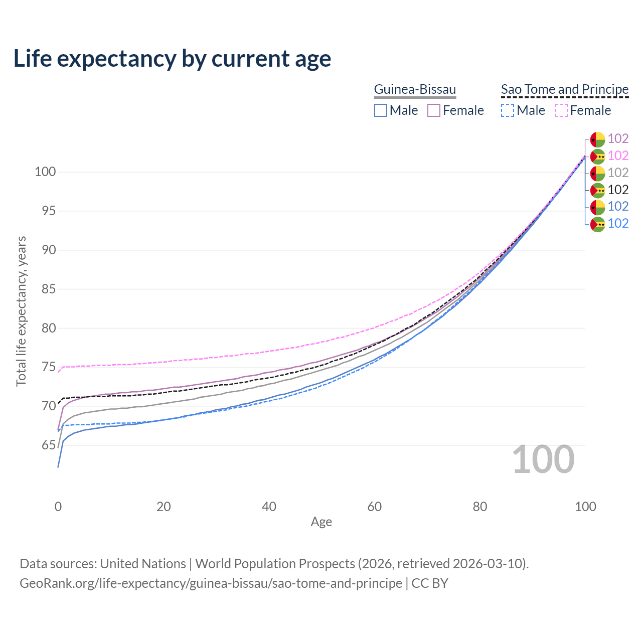 This life expectancy calculator shows the odds of living to 100, 95, 90, and below based on current age for both males and females in Guinea-Bissau and Sao Tome and Principe, along with mean and median age of death. The calculations are based on the 2026 life tables (actuarial tables) from the UN World Population Prospects.