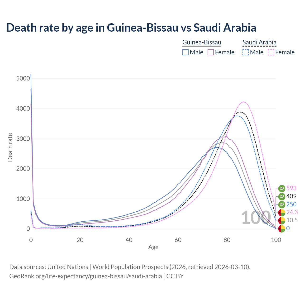 In Guinea-Bissau, the most common age of death is 0, compared to 85 in Saudi Arabia. The median age of death is 71.8 in Guinea-Bissau and 82.5 in Saudi Arabia, meaning only half of each cohort is expected to live past that age.