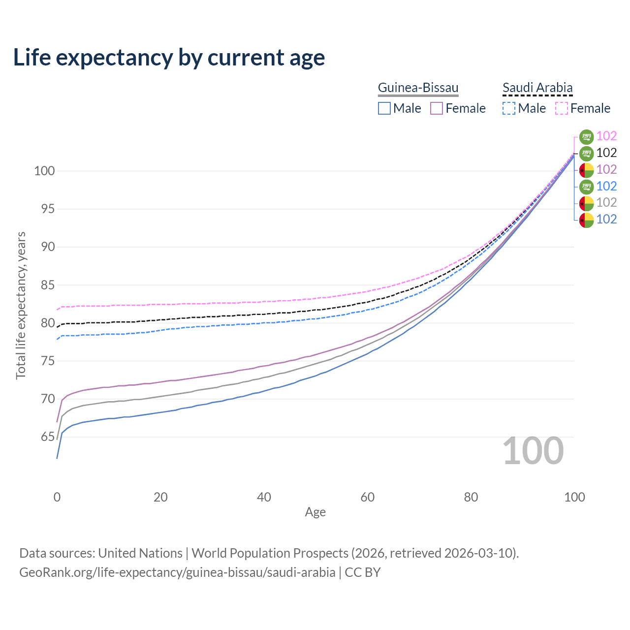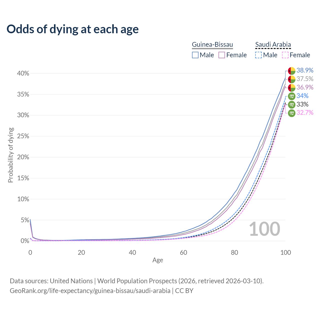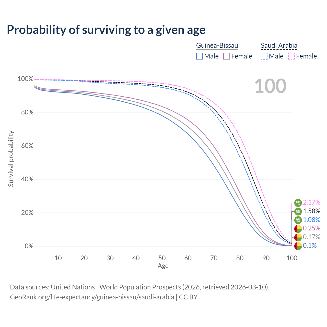 This life expectancy calculator shows the odds of living to 100, 95, 90, and below based on current age for both males and females in Guinea-Bissau and Saudi Arabia, along with mean and median age of death. The calculations are based on the 2026 life tables (actuarial tables) from the UN World Population Prospects.