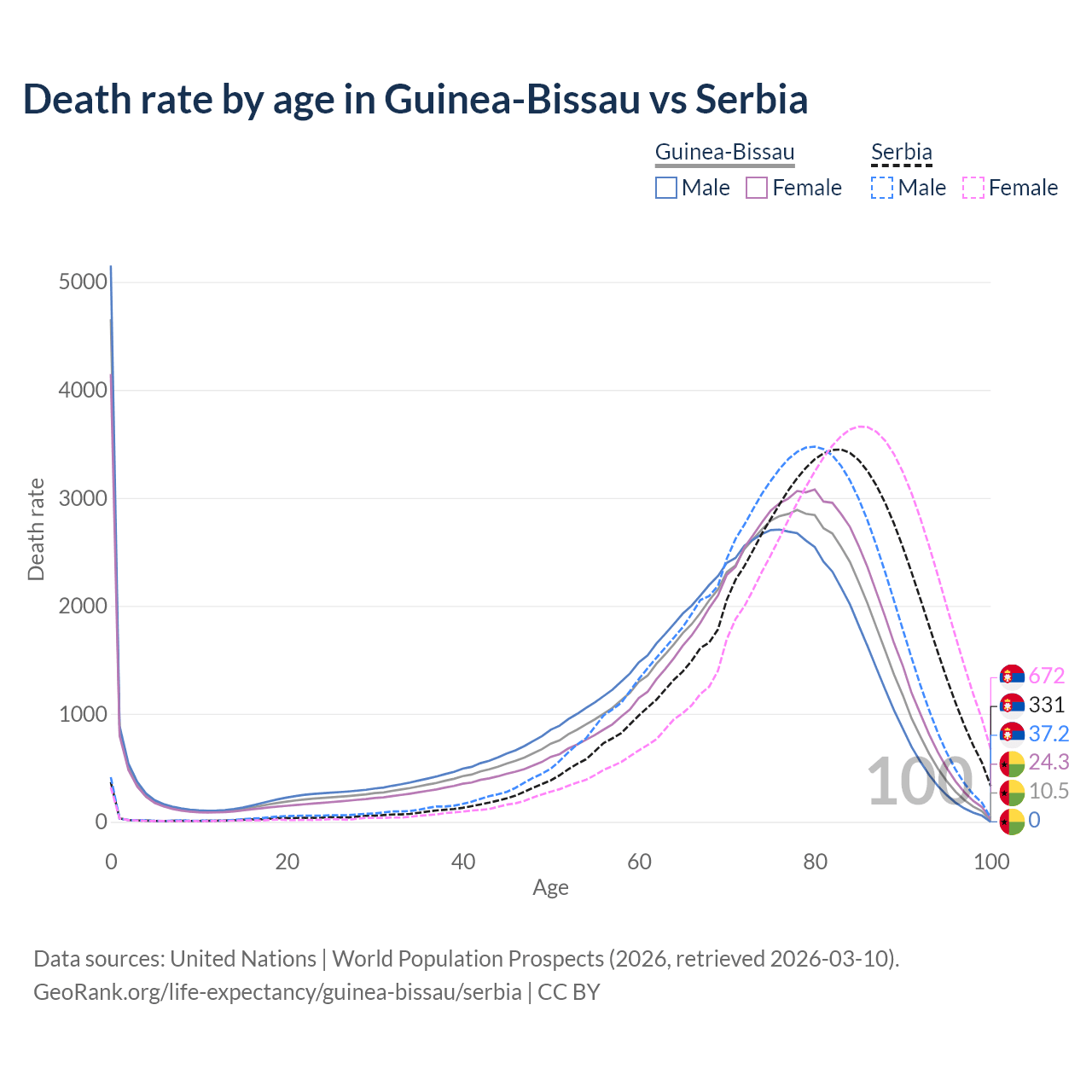 In Guinea-Bissau, the most common age of death is 0, compared to 83 in Serbia. The median age of death is 71.8 in Guinea-Bissau and 79.6 in Serbia, meaning only half of each cohort is expected to live past that age.