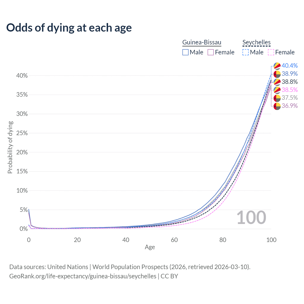 This life expectancy calculator shows the odds of living to 100, 95, 90, and below based on current age for both males and females in Guinea-Bissau and the Seychelles, along with mean and median age of death. The calculations are based on the 2026 life tables (actuarial tables) from the UN World Population Prospects.