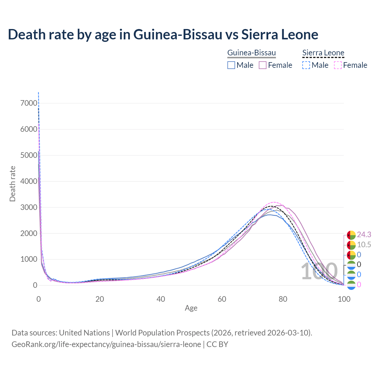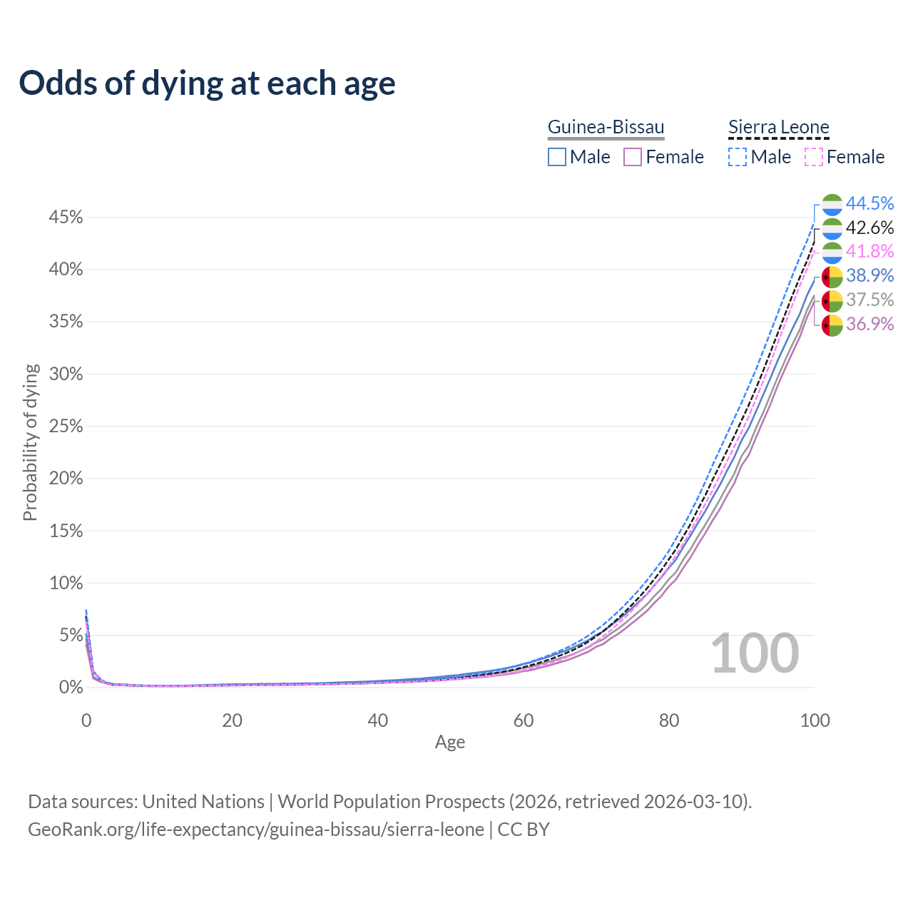 This life expectancy calculator shows the odds of living to 100, 95, 90, and below based on current age for both males and females in Guinea-Bissau and Sierra Leone, along with mean and median age of death. The calculations are based on the 2026 life tables (actuarial tables) from the UN World Population Prospects.