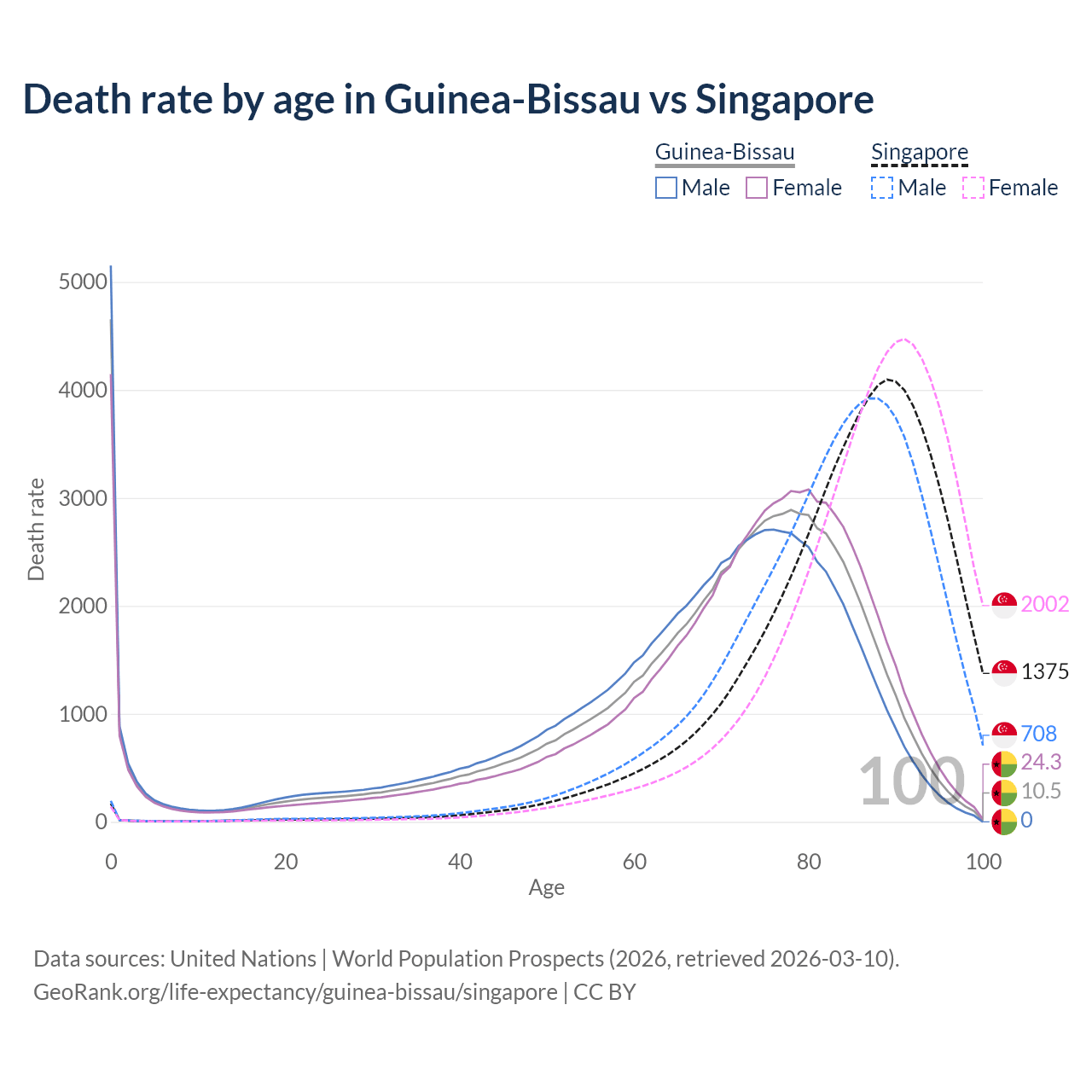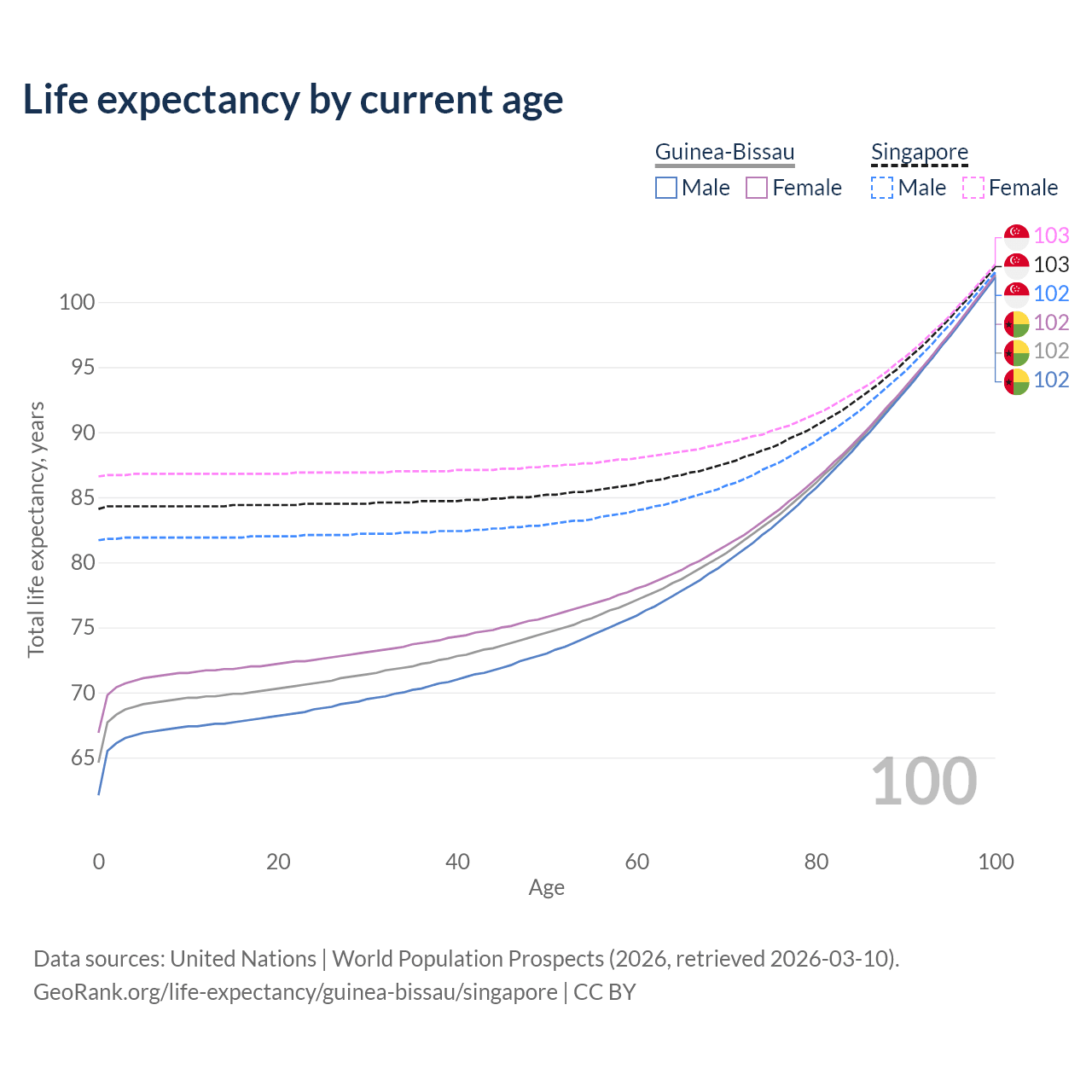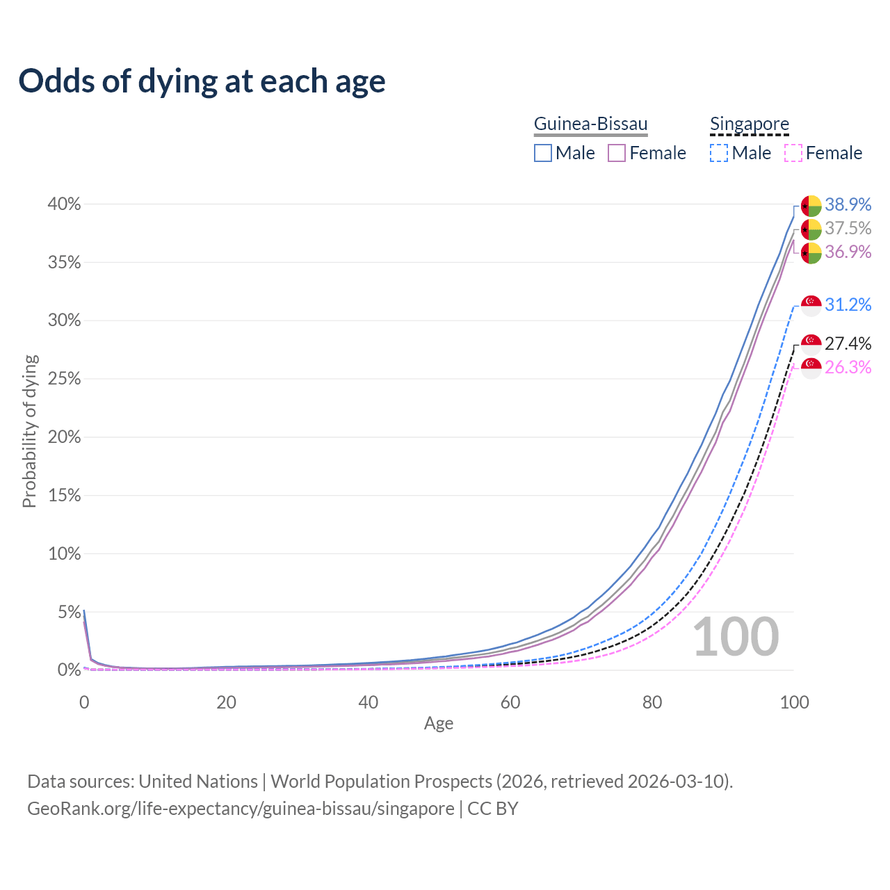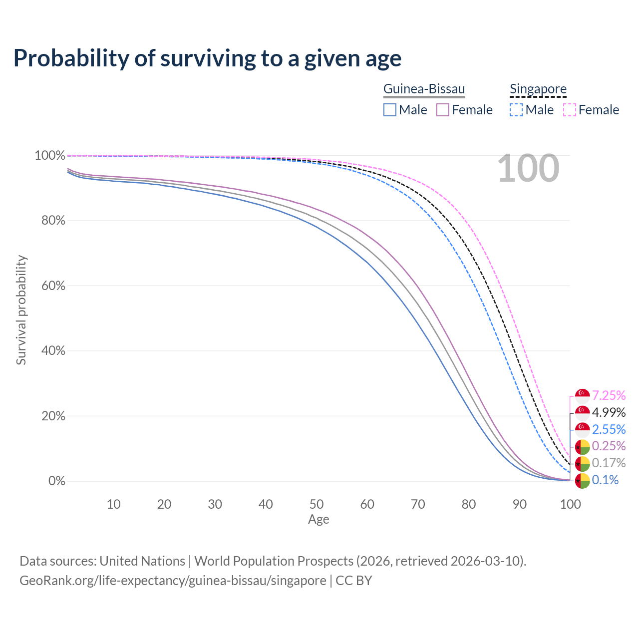 This life expectancy calculator shows the odds of living to 100, 95, 90, and below based on current age for both males and females in Guinea-Bissau and Singapore, along with mean and median age of death. The calculations are based on the 2026 life tables (actuarial tables) from the UN World Population Prospects.
