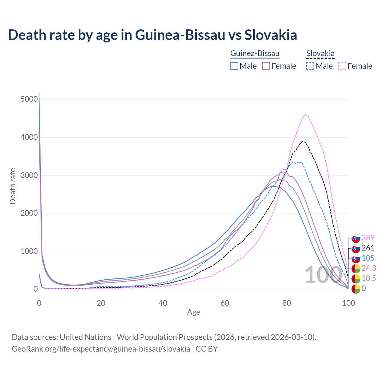 In Guinea-Bissau, the most common age of death is 0, compared to 85 in Slovakia. The median age of death is 71.8 in Guinea-Bissau and 82 in Slovakia, meaning only half of each cohort is expected to live past that age.