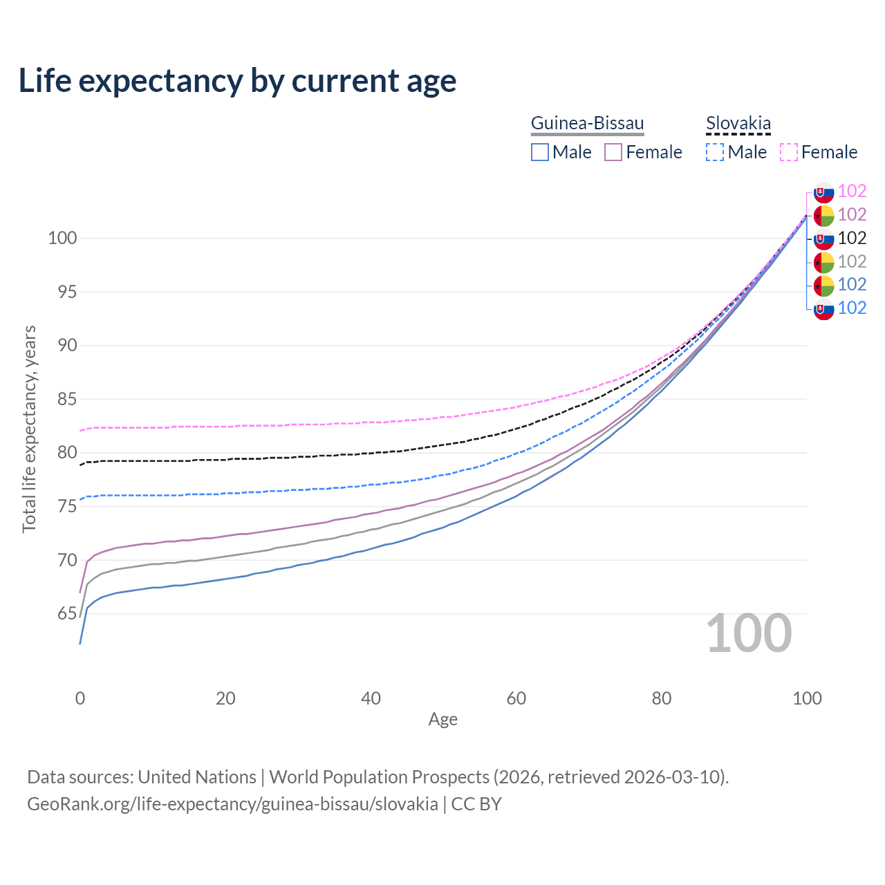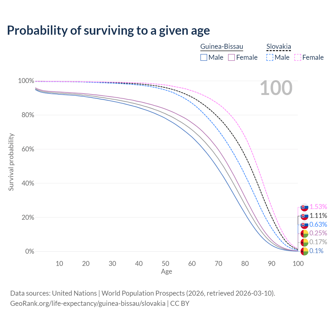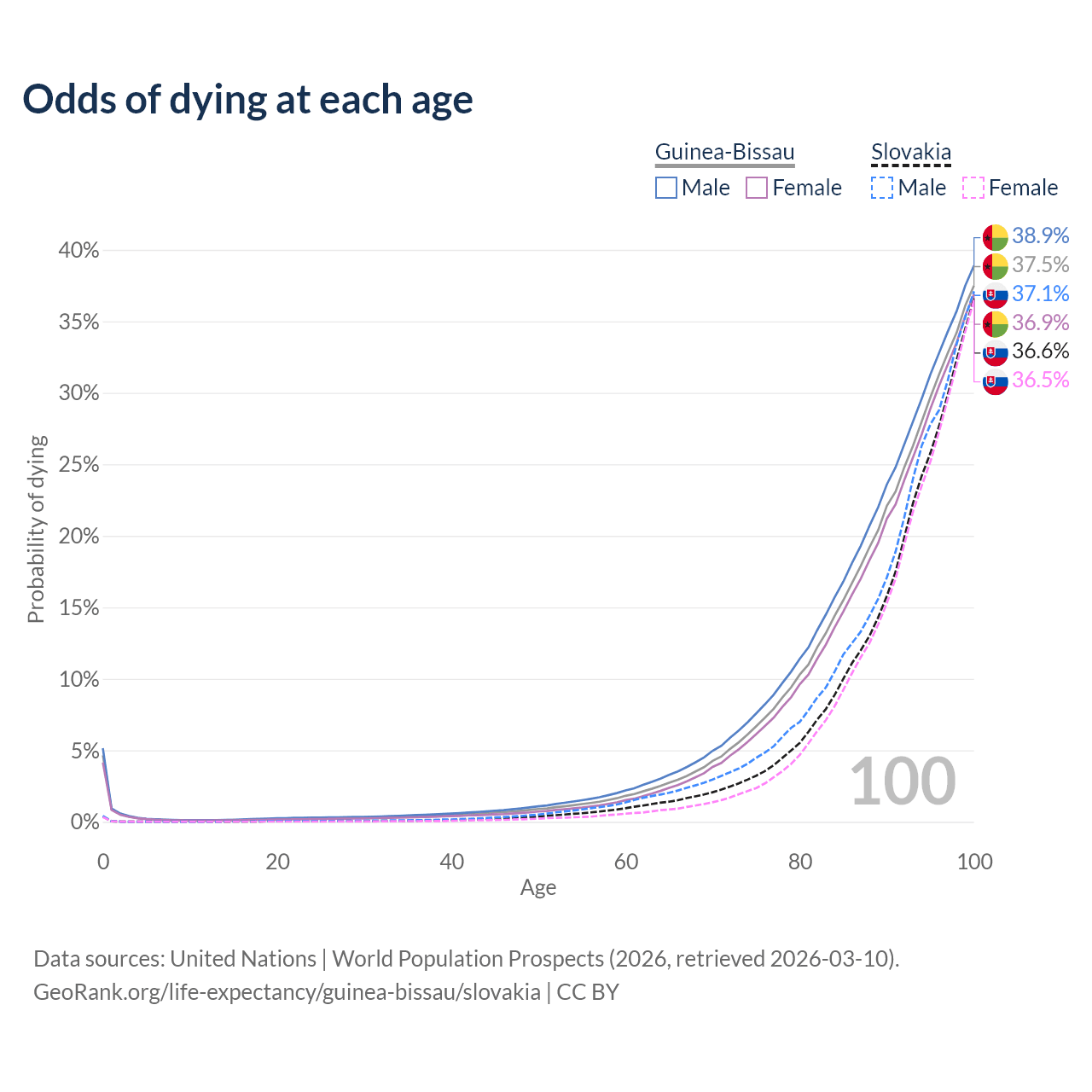 This life expectancy calculator shows the odds of living to 100, 95, 90, and below based on current age for both males and females in Guinea-Bissau and Slovakia, along with mean and median age of death. The calculations are based on the 2026 life tables (actuarial tables) from the UN World Population Prospects.