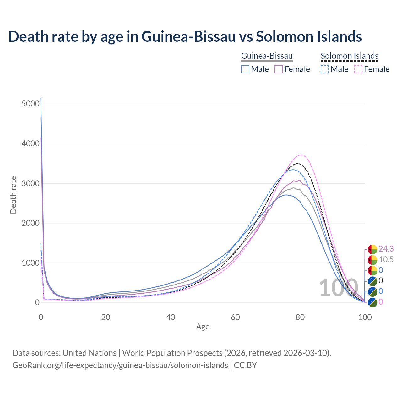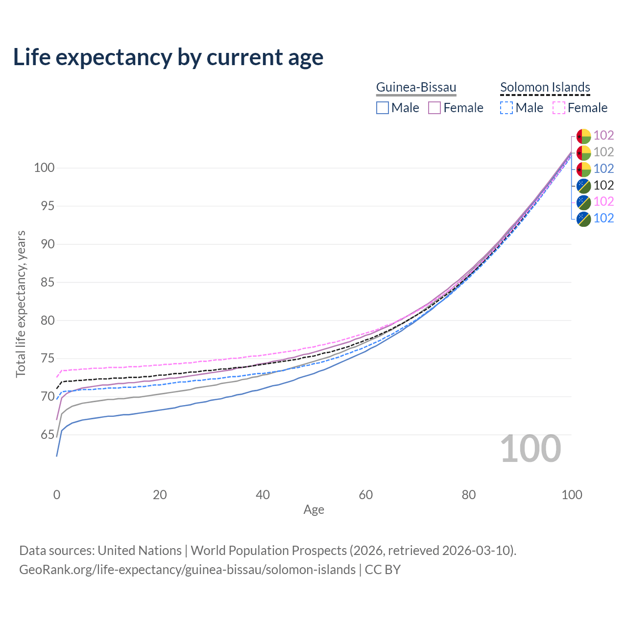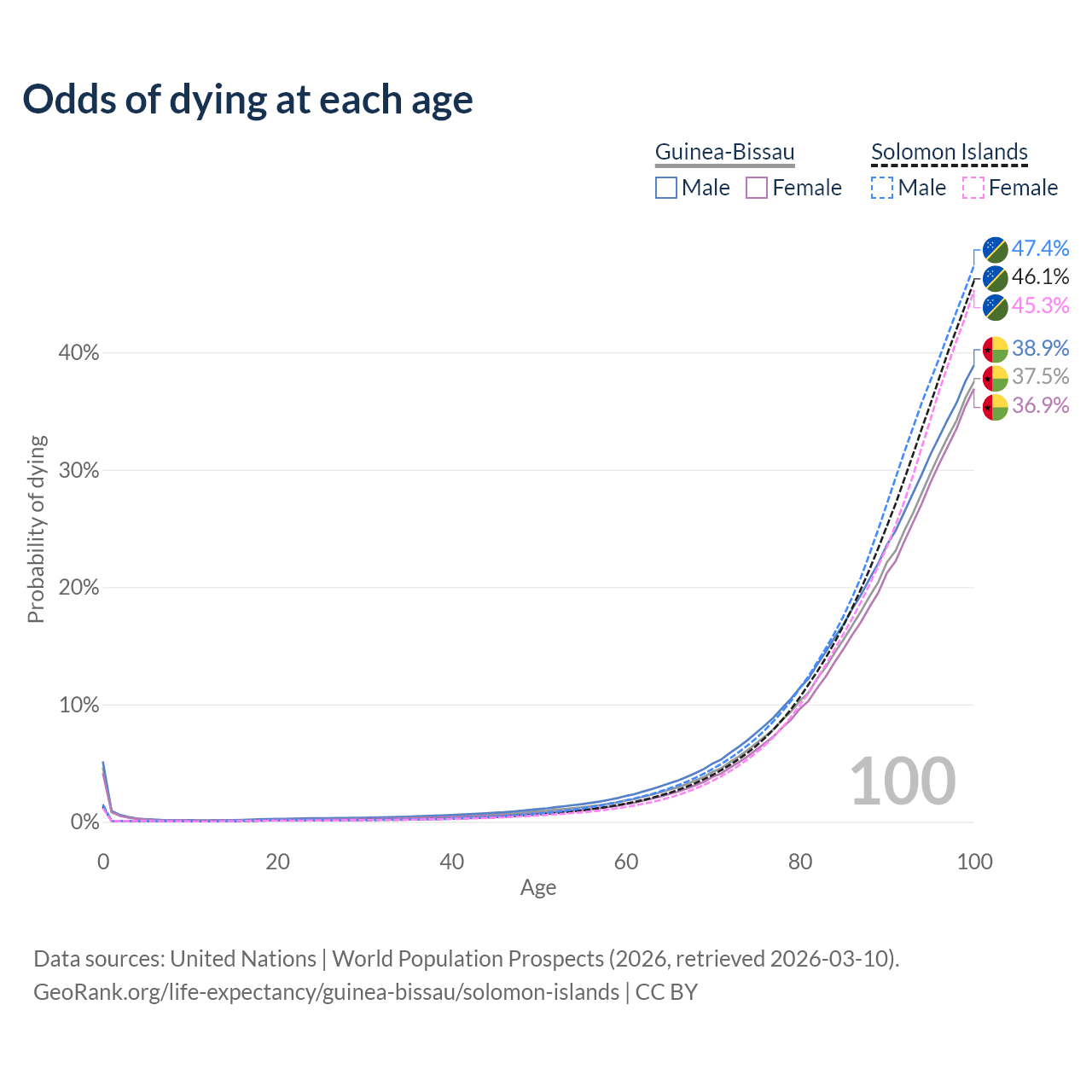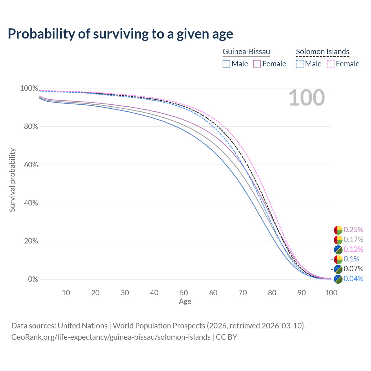 This life expectancy calculator shows the odds of living to 100, 95, 90, and below based on current age for both males and females in Guinea-Bissau and the Solomon Islands, along with mean and median age of death. The calculations are based on the 2026 life tables (actuarial tables) from the UN World Population Prospects.