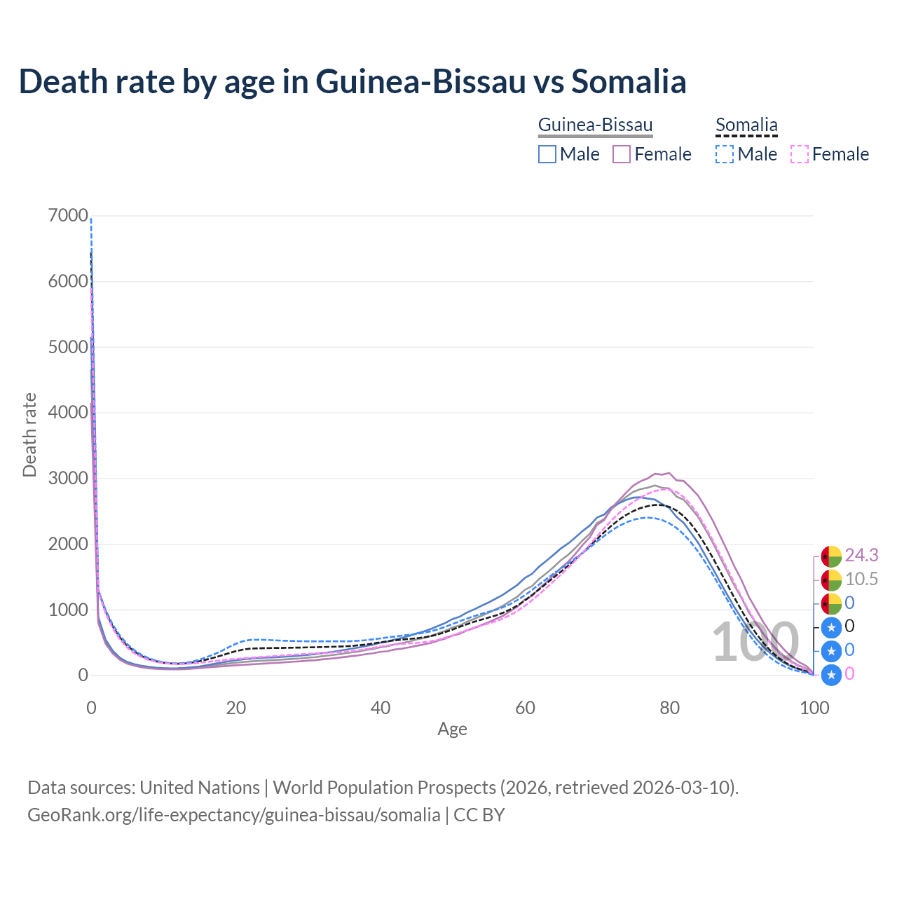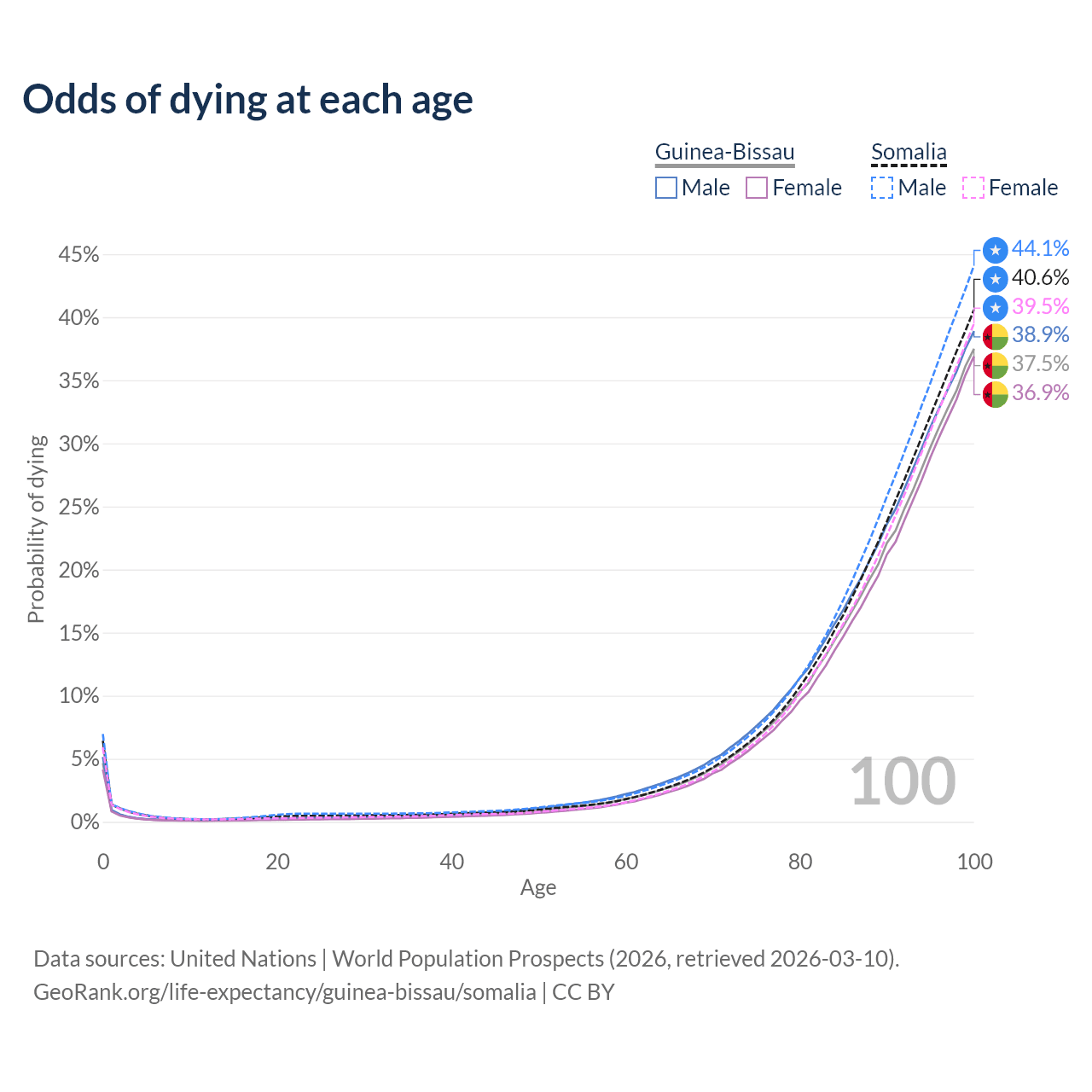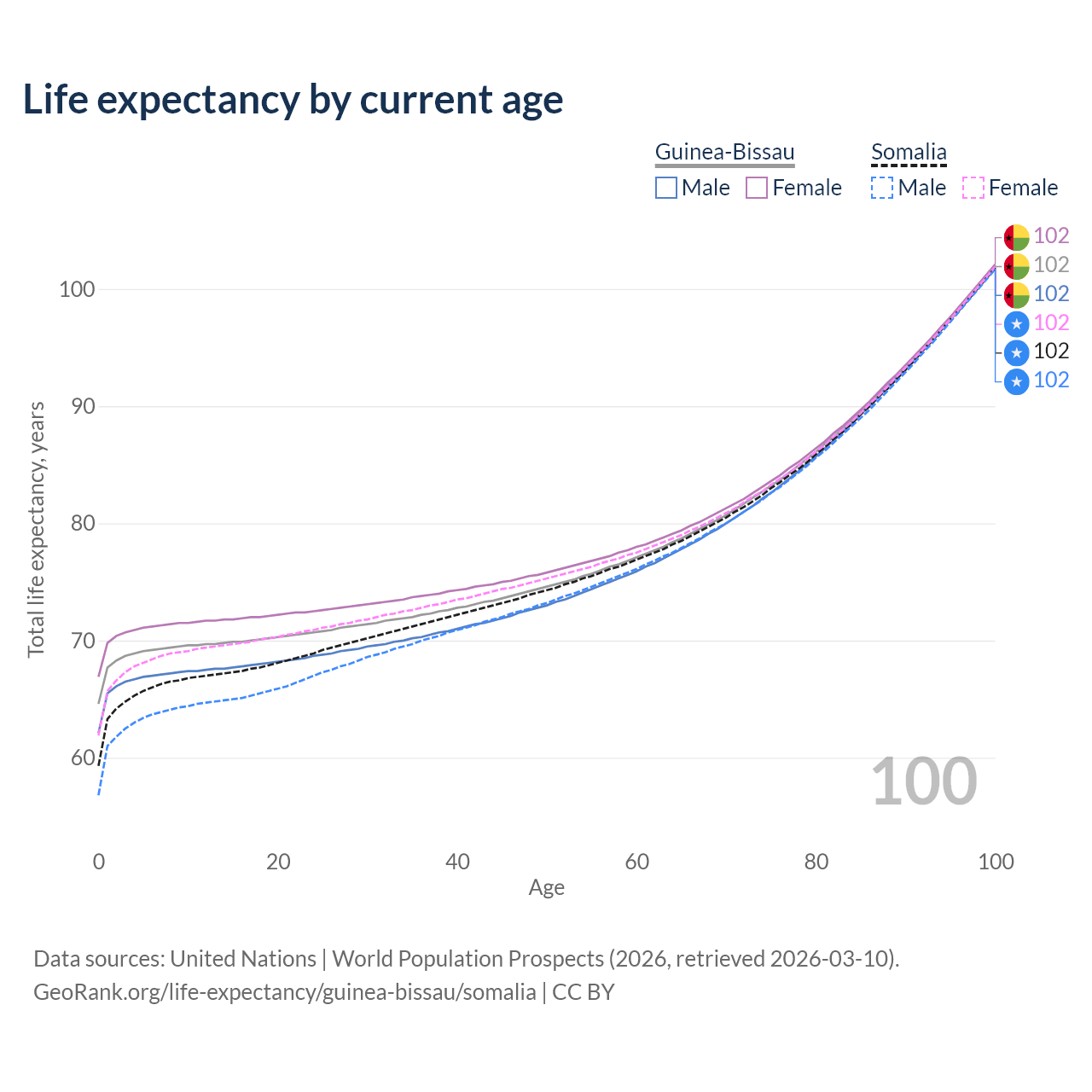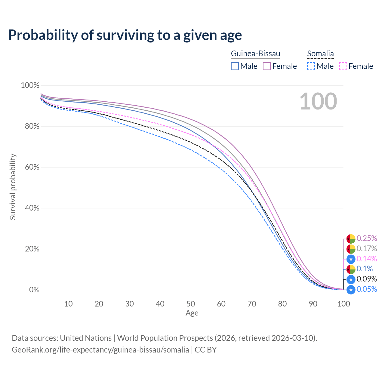 This life expectancy calculator shows the odds of living to 100, 95, 90, and below based on current age for both males and females in Guinea-Bissau and Somalia, along with mean and median age of death. The calculations are based on the 2026 life tables (actuarial tables) from the UN World Population Prospects.