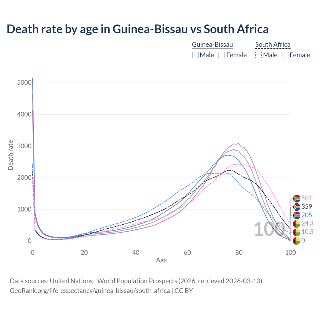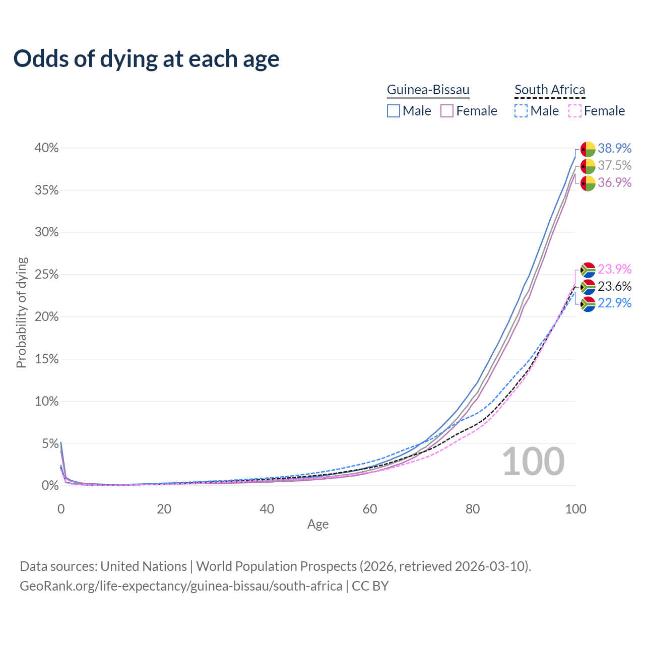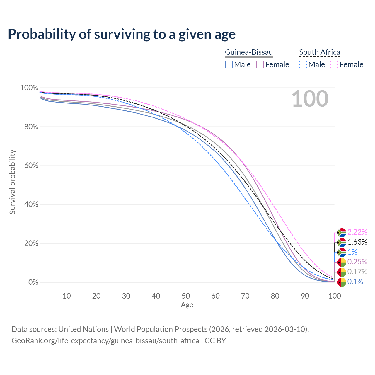 This life expectancy calculator shows the odds of living to 100, 95, 90, and below based on current age for both males and females in Guinea-Bissau and South Africa, along with mean and median age of death. The calculations are based on the 2026 life tables (actuarial tables) from the UN World Population Prospects.