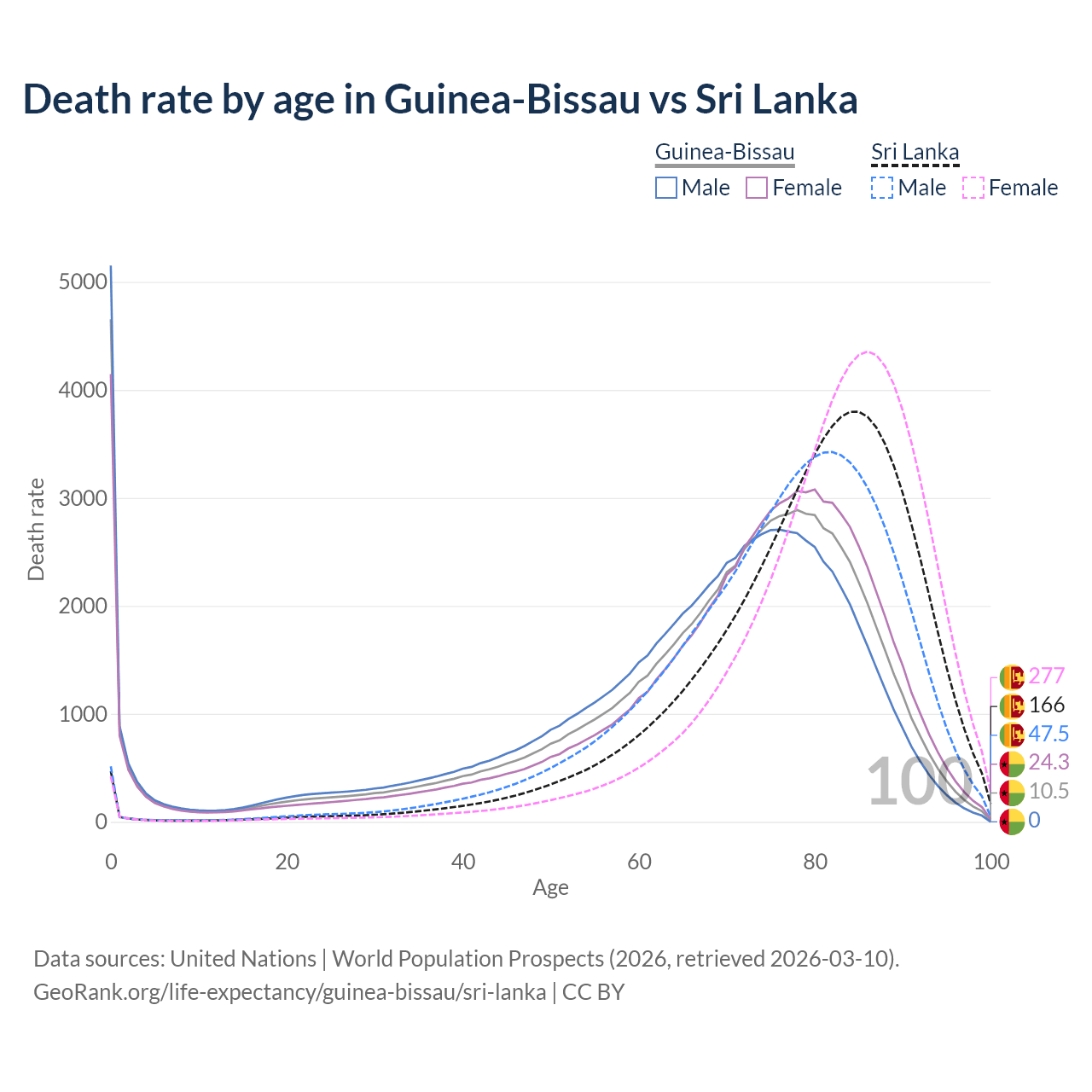 In Guinea-Bissau, the most common age of death is 0, compared to 85 in Sri Lanka. The median age of death is 71.8 in Guinea-Bissau and 81 in Sri Lanka, meaning only half of each cohort is expected to live past that age.