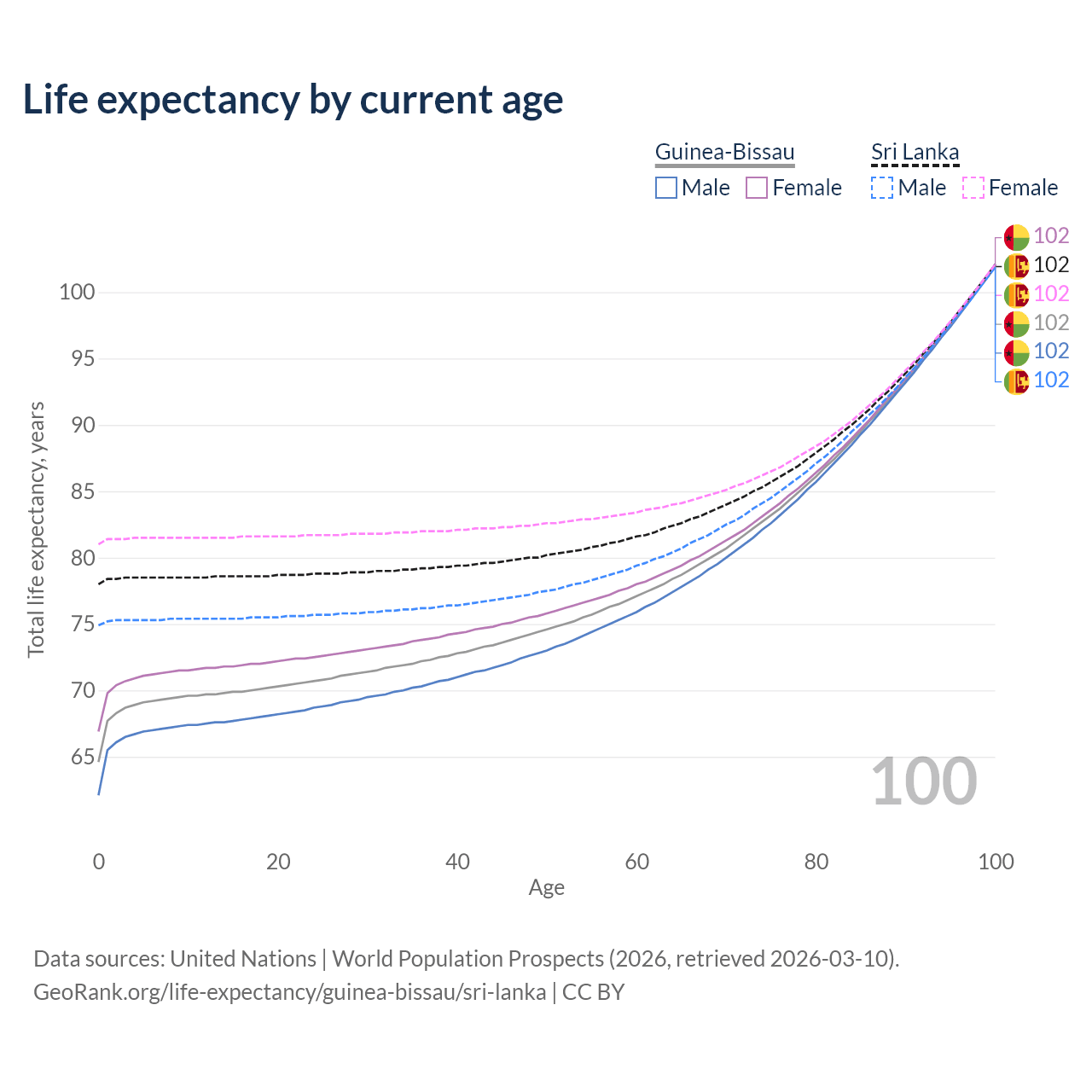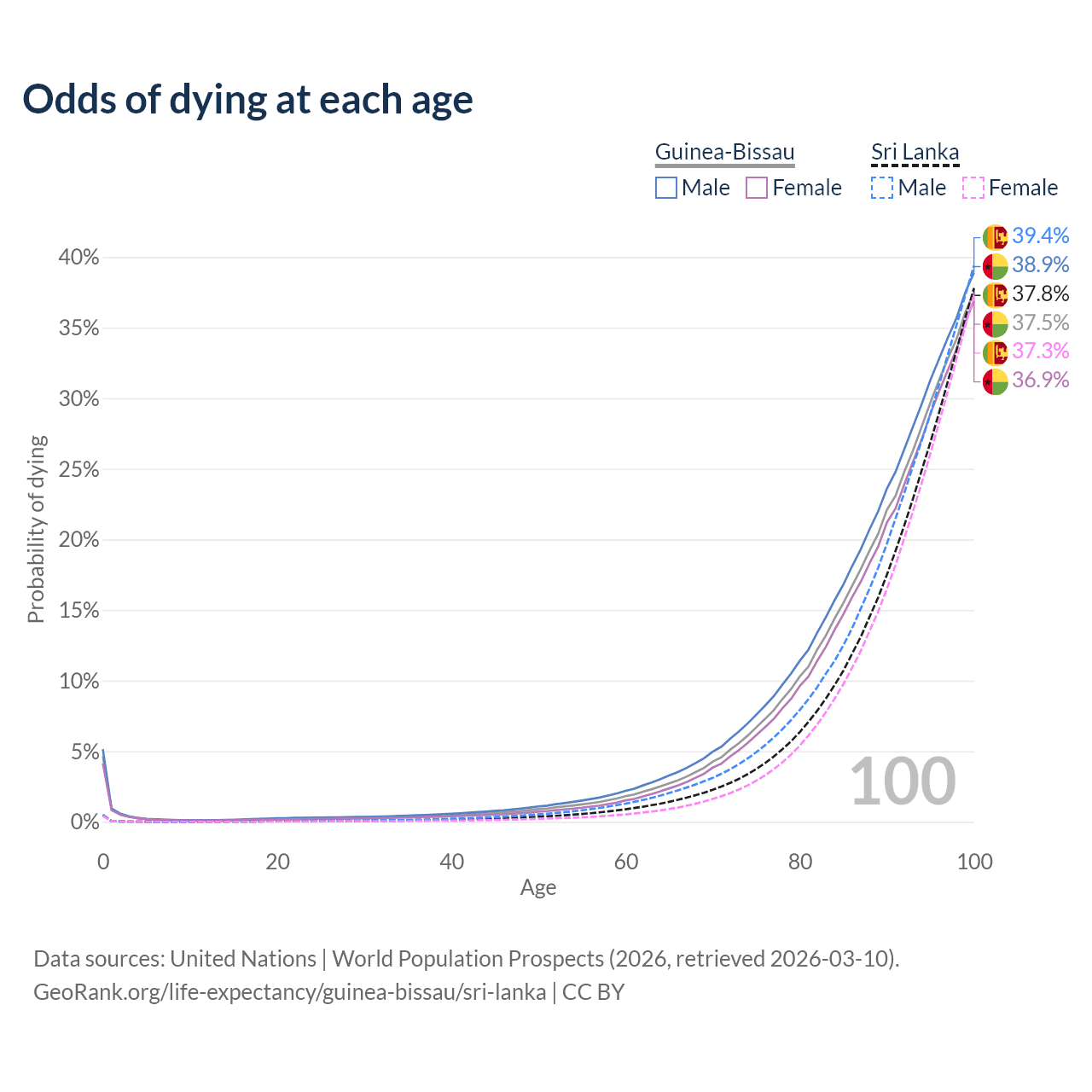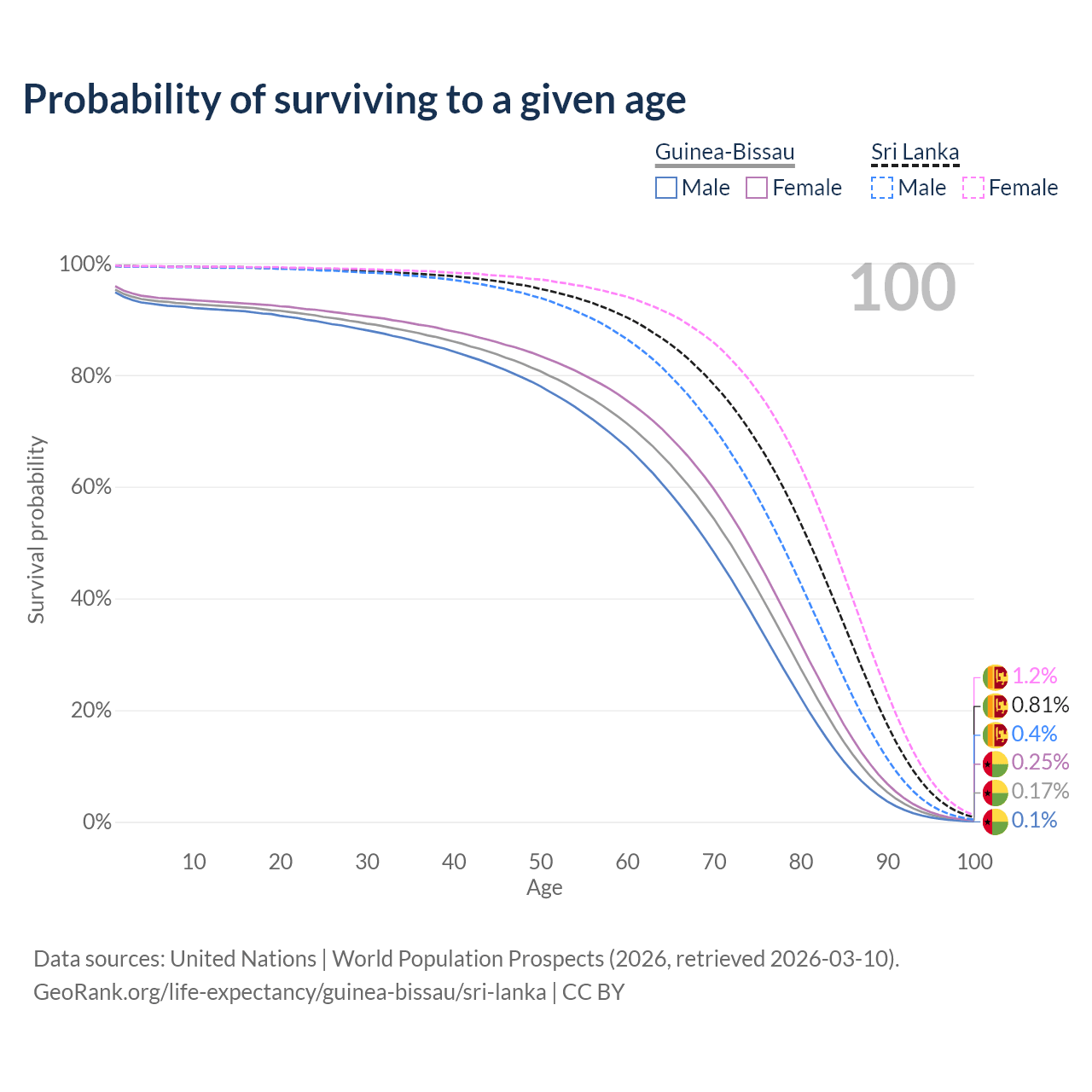 This life expectancy calculator shows the odds of living to 100, 95, 90, and below based on current age for both males and females in Guinea-Bissau and Sri Lanka, along with mean and median age of death. The calculations are based on the 2026 life tables (actuarial tables) from the UN World Population Prospects.