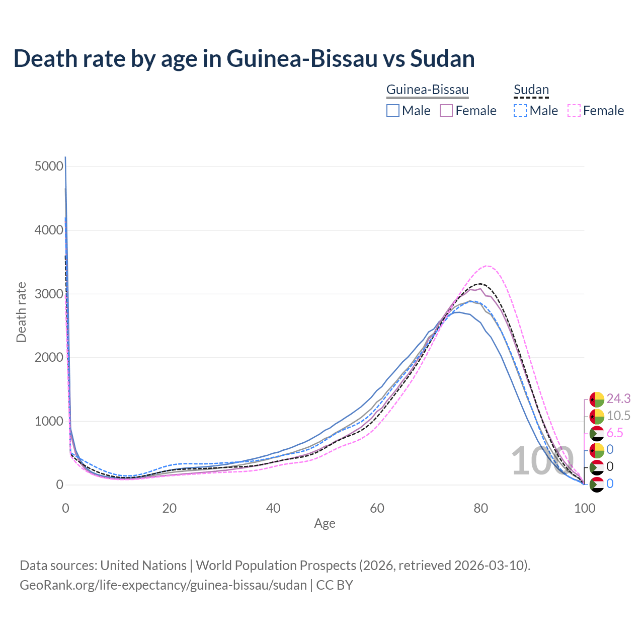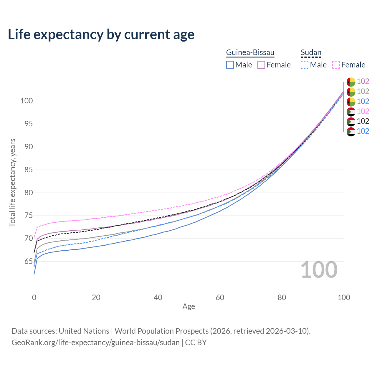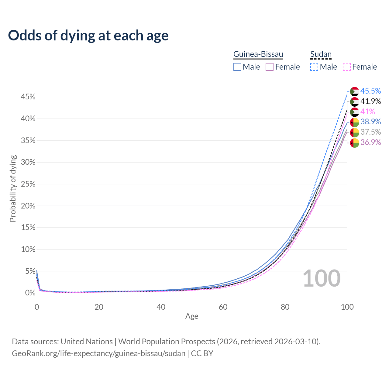 This life expectancy calculator shows the odds of living to 100, 95, 90, and below based on current age for both males and females in Guinea-Bissau and Sudan, along with mean and median age of death. The calculations are based on the 2026 life tables (actuarial tables) from the UN World Population Prospects.