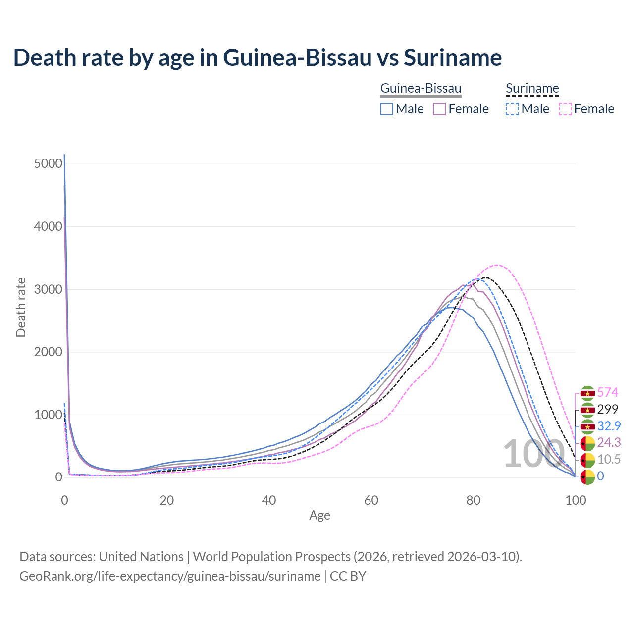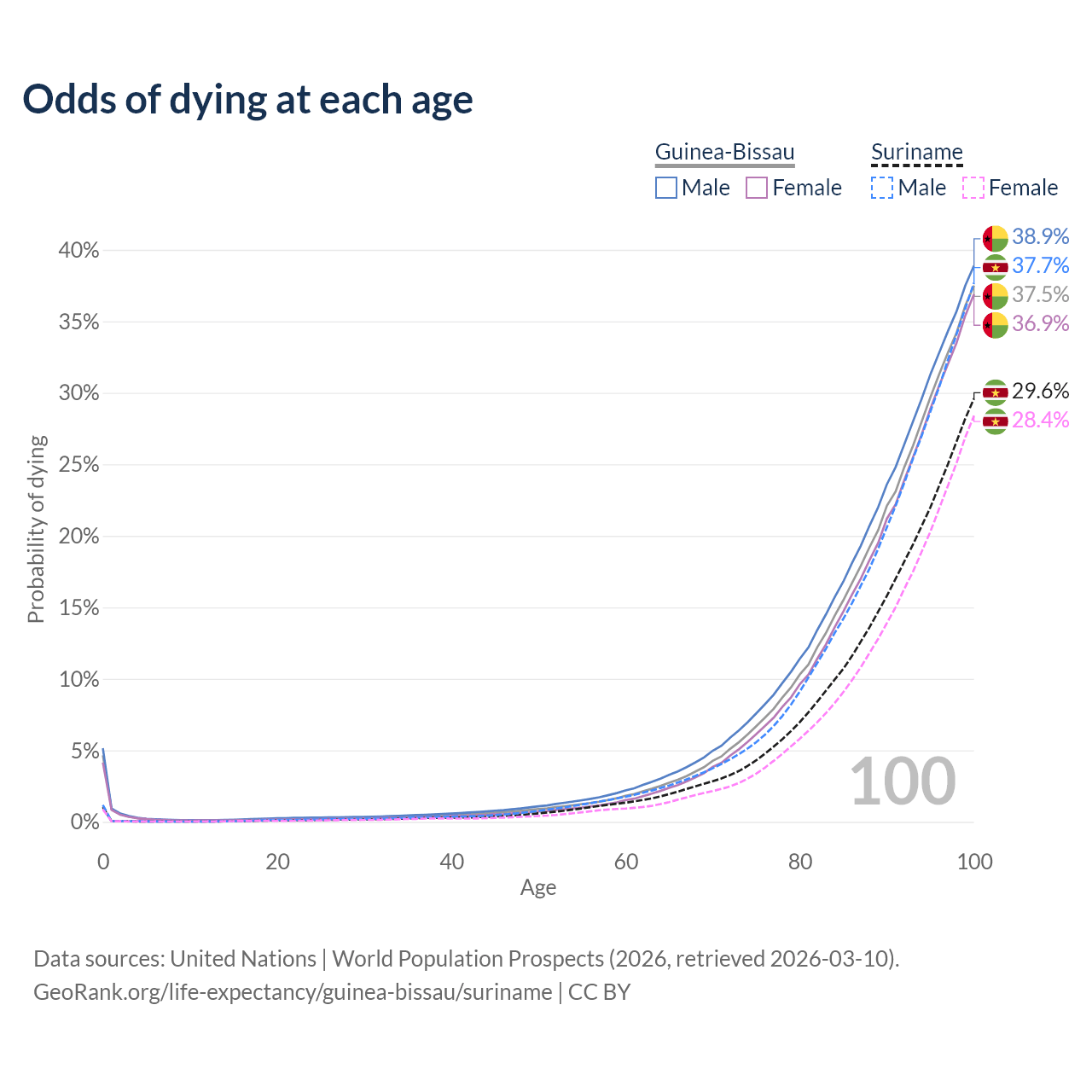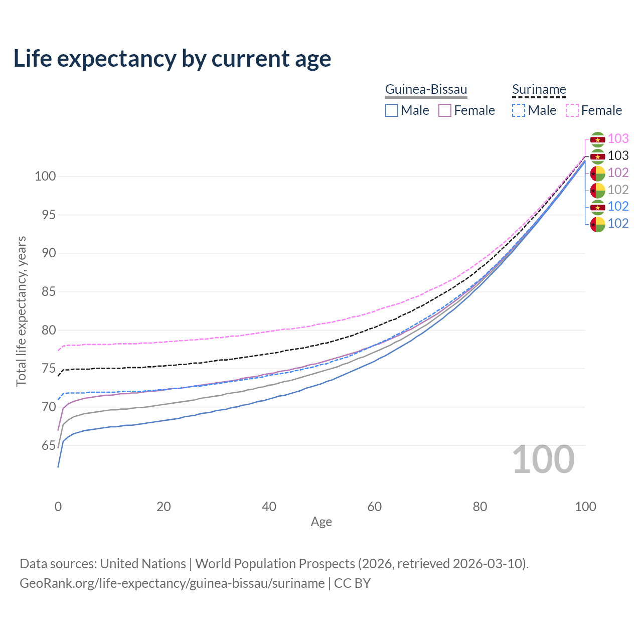 This life expectancy calculator shows the odds of living to 100, 95, 90, and below based on current age for both males and females in Guinea-Bissau and Suriname, along with mean and median age of death. The calculations are based on the 2026 life tables (actuarial tables) from the UN World Population Prospects.