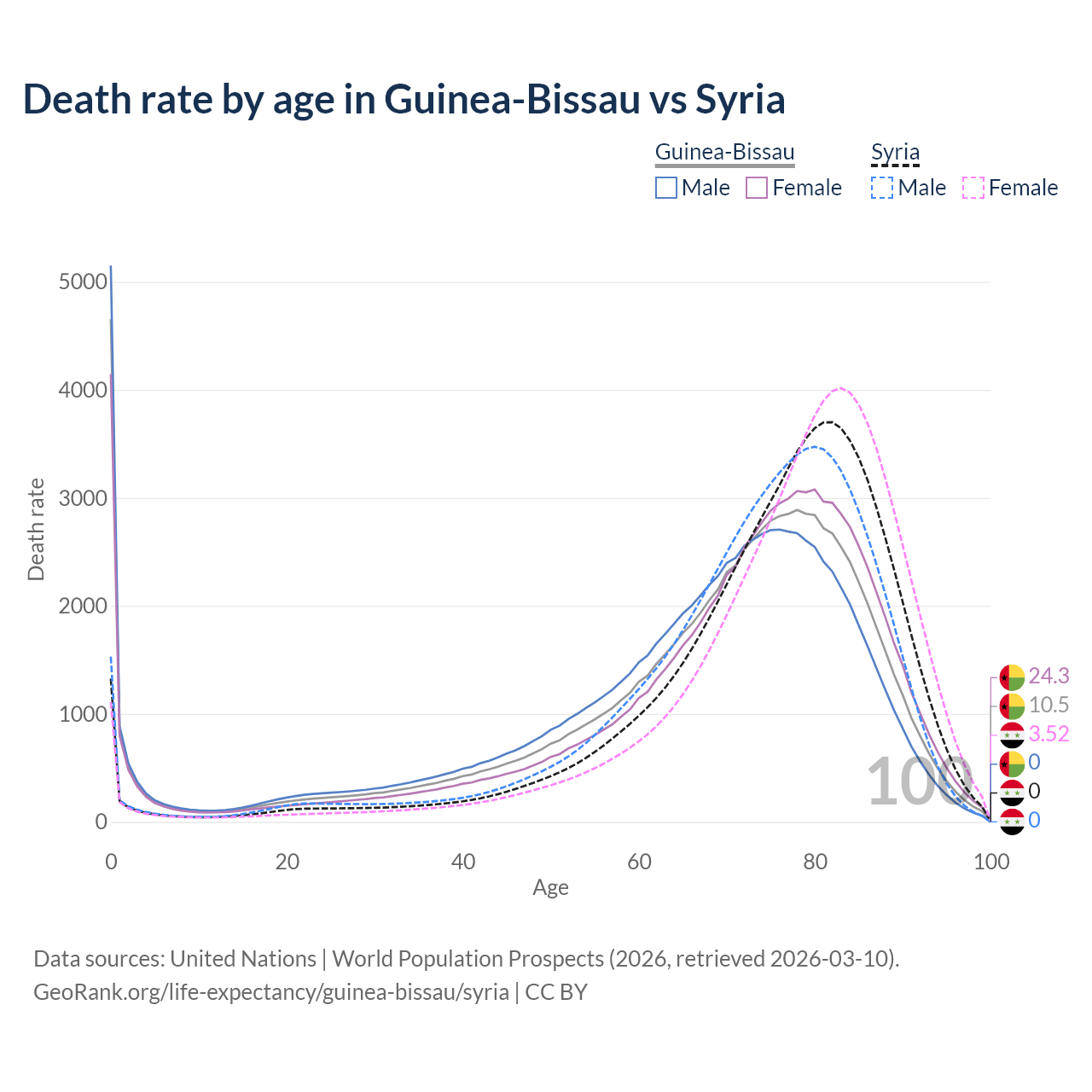 In Guinea-Bissau, the most common age of death is 0, compared to 82 in Syria. The median age of death is 71.8 in Guinea-Bissau and 77.7 in Syria, meaning only half of each cohort is expected to live past that age.