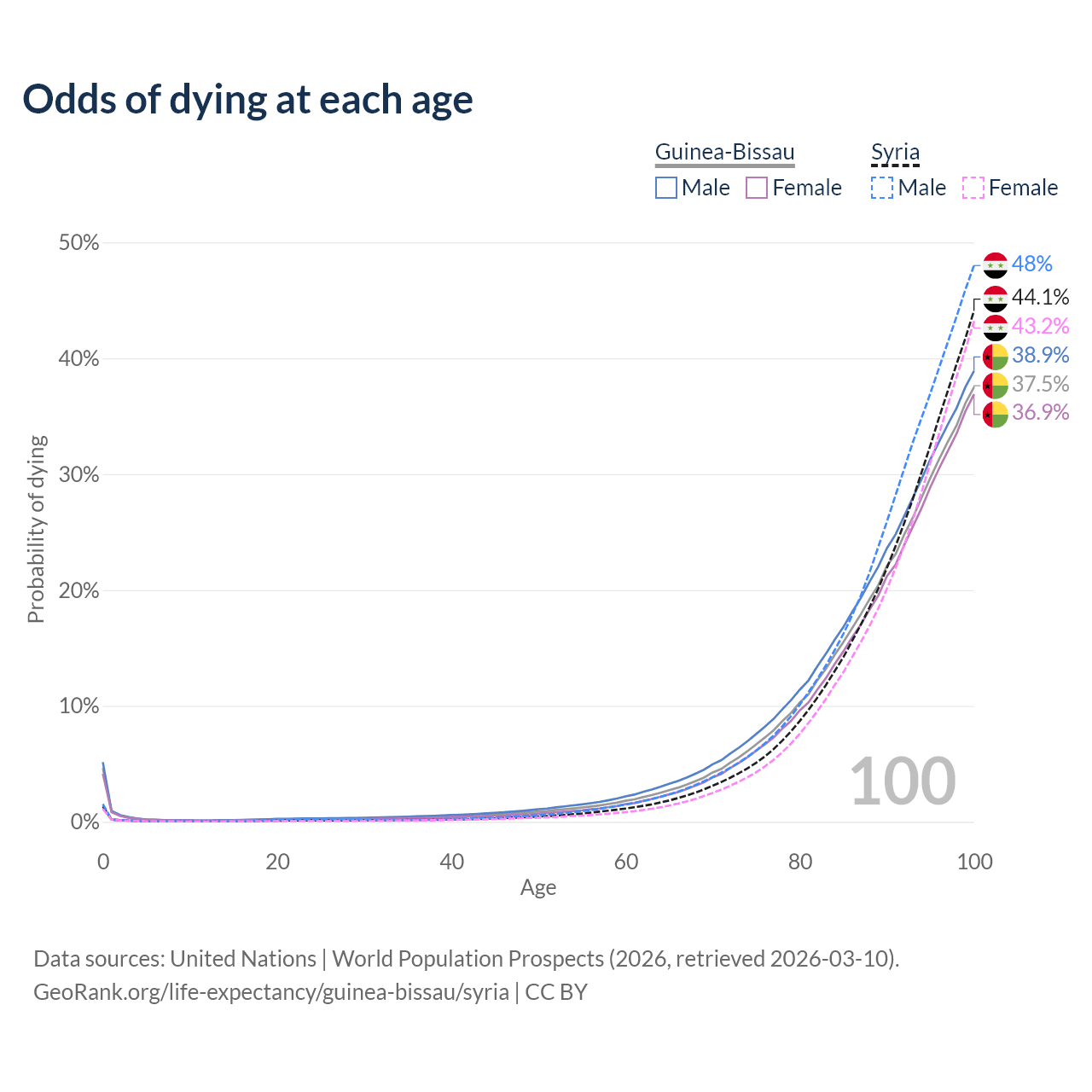 This life expectancy calculator shows the odds of living to 100, 95, 90, and below based on current age for both males and females in Guinea-Bissau and Syria, along with mean and median age of death. The calculations are based on the 2026 life tables (actuarial tables) from the UN World Population Prospects.