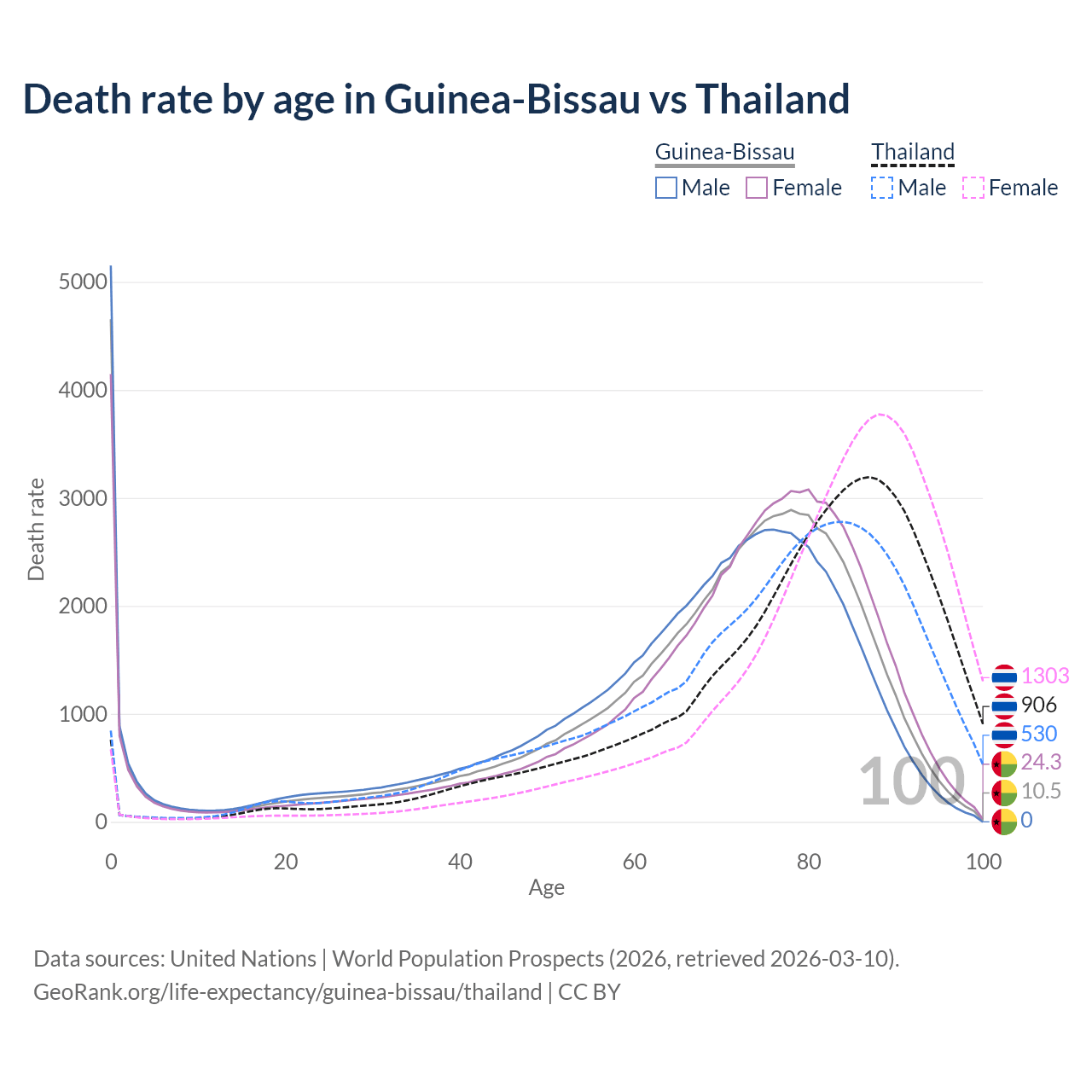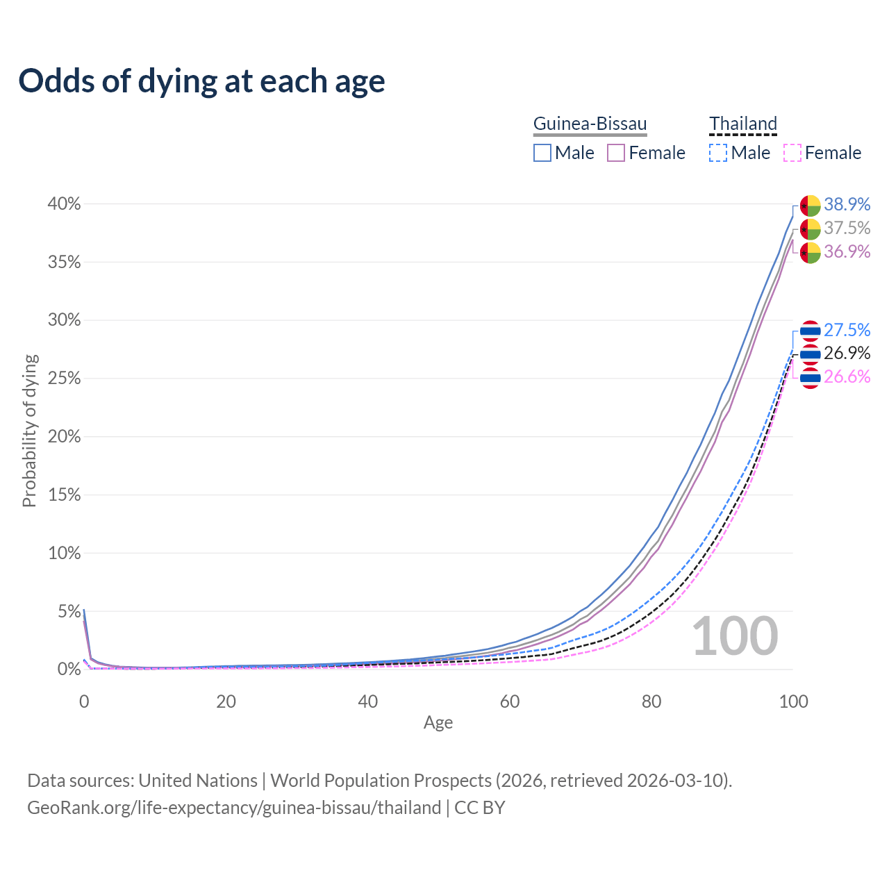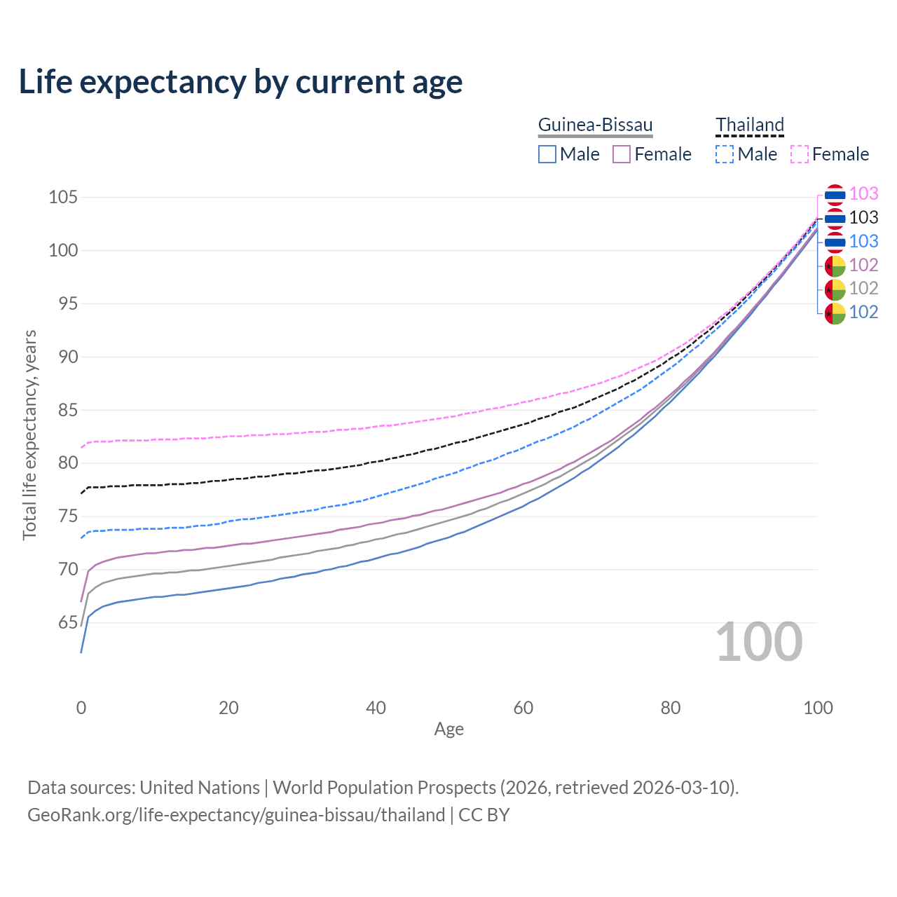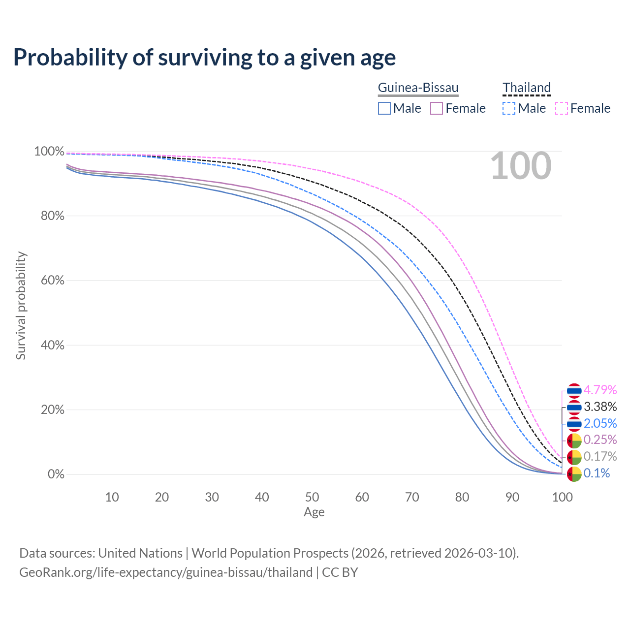 This life expectancy calculator shows the odds of living to 100, 95, 90, and below based on current age for both males and females in Guinea-Bissau and Thailand, along with mean and median age of death. The calculations are based on the 2026 life tables (actuarial tables) from the UN World Population Prospects.