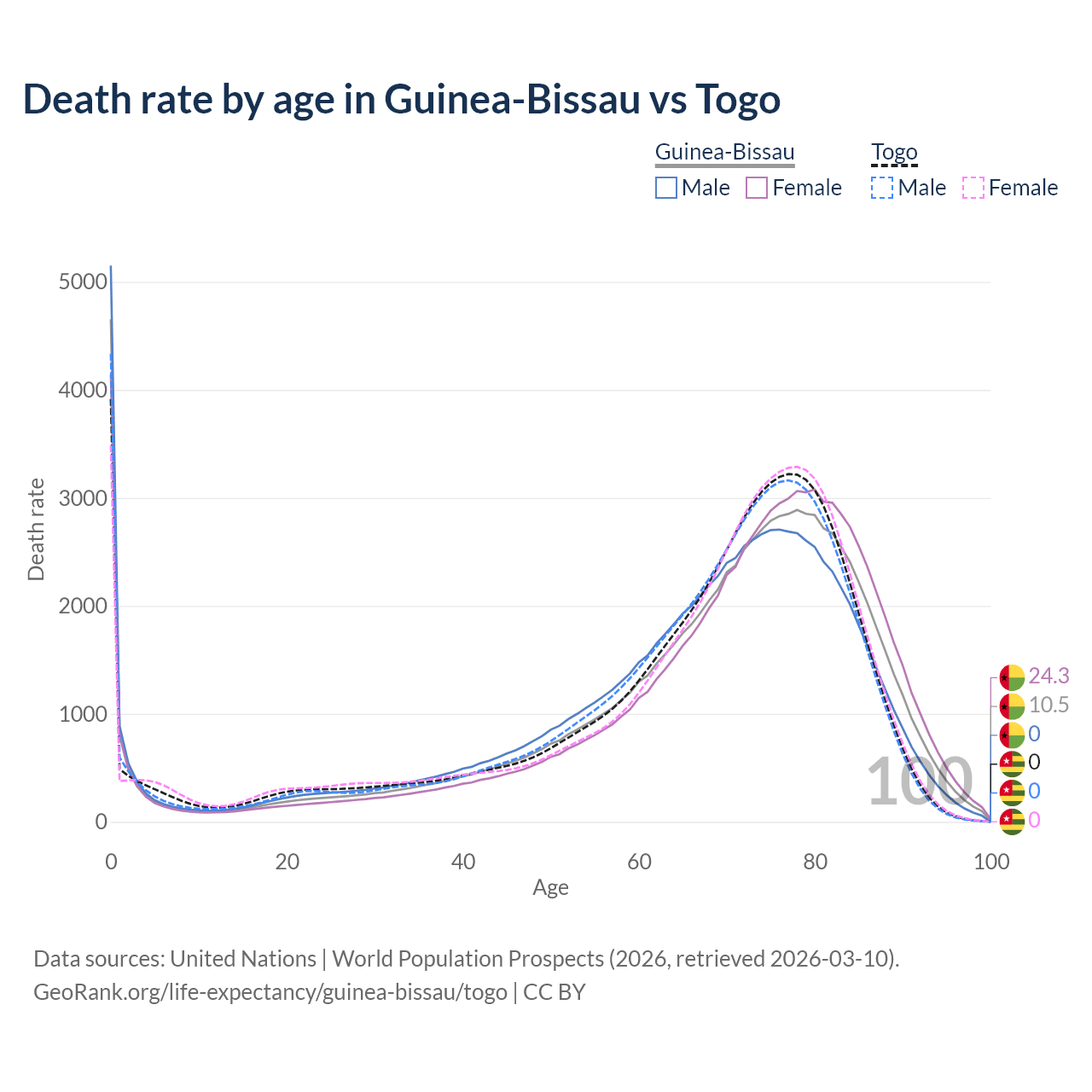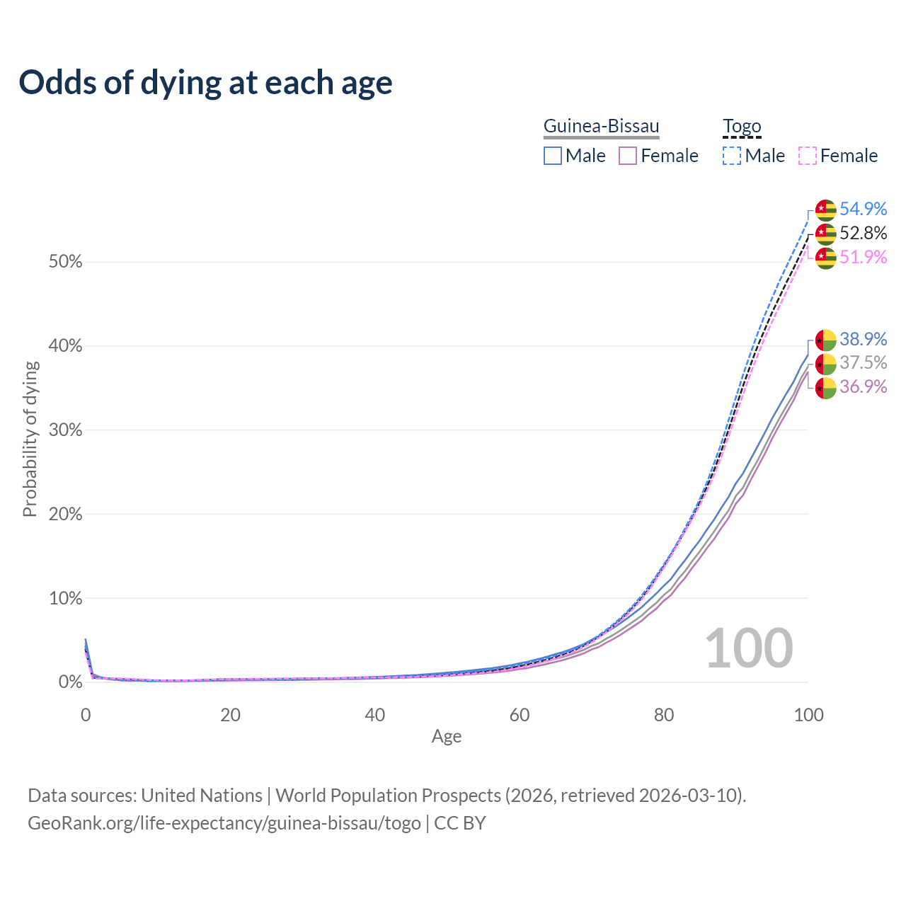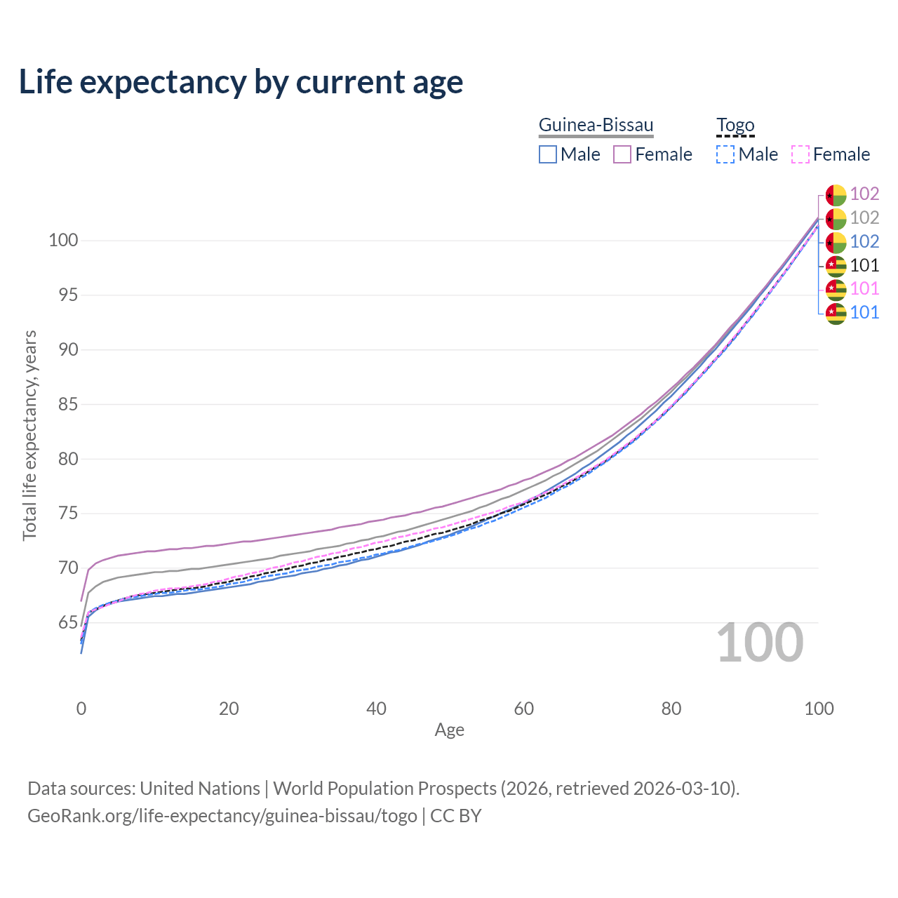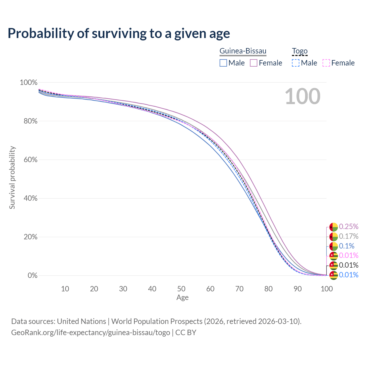 This life expectancy calculator shows the odds of living to 100, 95, 90, and below based on current age for both males and females in Guinea-Bissau and Togo, along with mean and median age of death. The calculations are based on the 2026 life tables (actuarial tables) from the UN World Population Prospects.