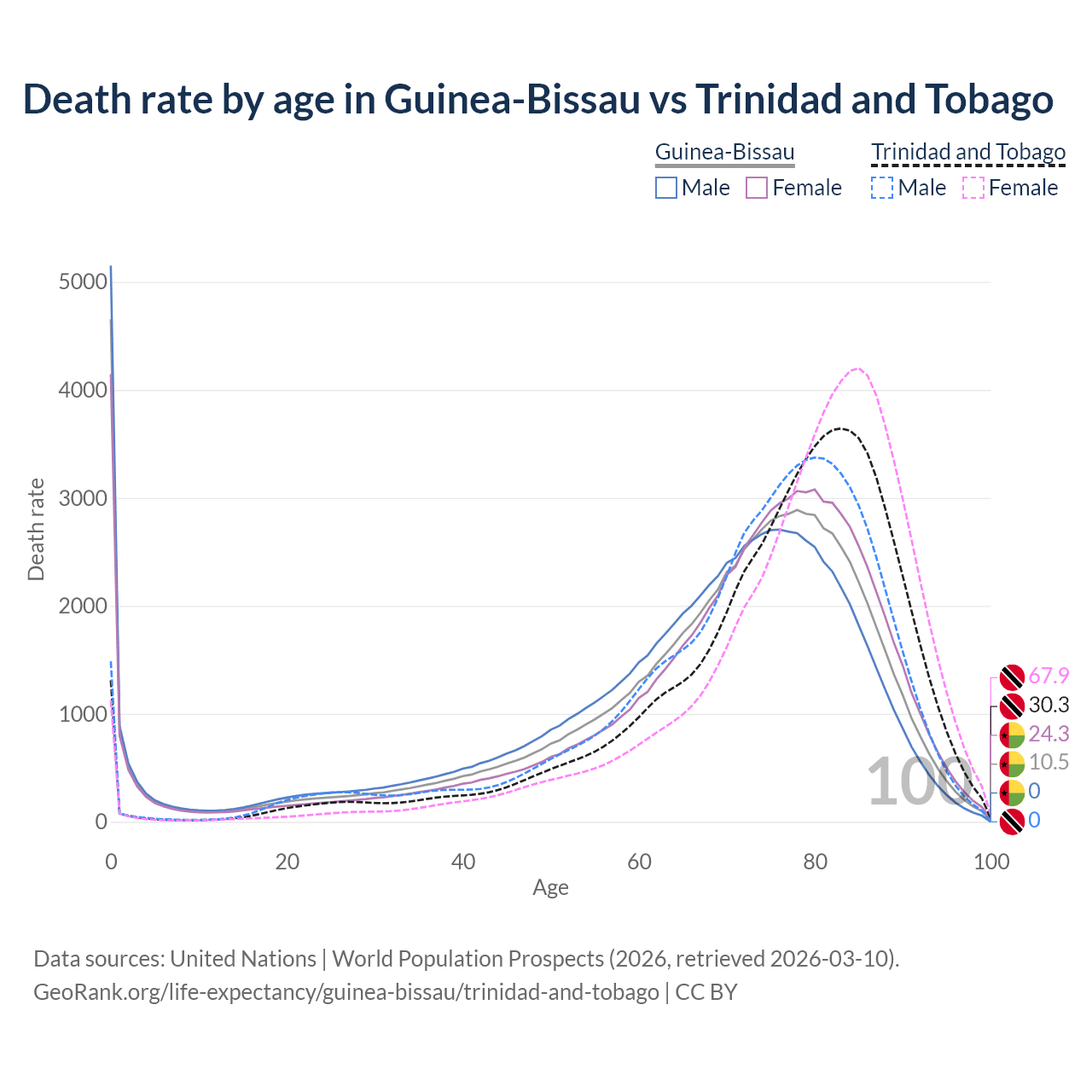 In Guinea-Bissau, the most common age of death is 0, compared to 83 in Trinidad and Tobago. The median age of death is 71.8 in Guinea-Bissau and 78.4 in Trinidad and Tobago, meaning only half of each cohort is expected to live past that age.