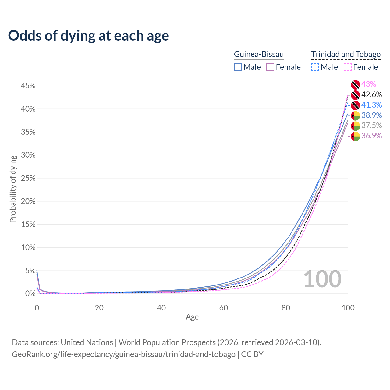 This life expectancy calculator shows the odds of living to 100, 95, 90, and below based on current age for both males and females in Guinea-Bissau and Trinidad and Tobago, along with mean and median age of death. The calculations are based on the 2026 life tables (actuarial tables) from the UN World Population Prospects.