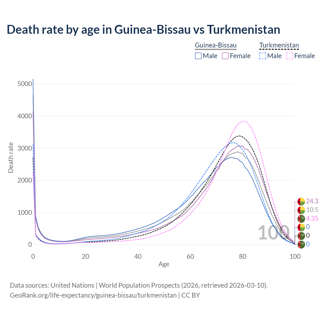 In Guinea-Bissau, the most common age of death is 0, compared to 79 in Turkmenistan. The median age of death is 71.8 in Guinea-Bissau and 75.1 in Turkmenistan, meaning only half of each cohort is expected to live past that age.