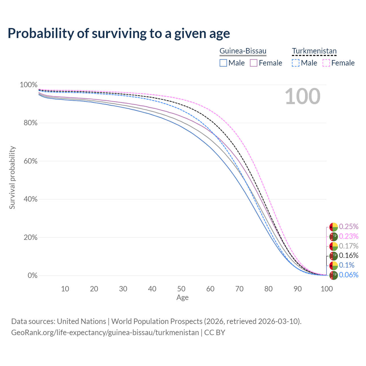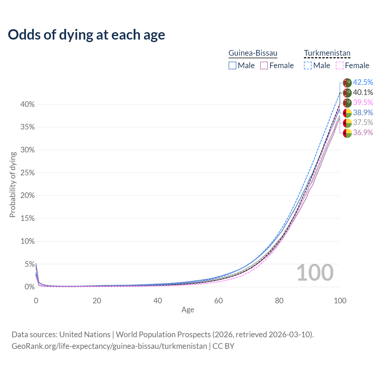 This life expectancy calculator shows the odds of living to 100, 95, 90, and below based on current age for both males and females in Guinea-Bissau and Turkmenistan, along with mean and median age of death. The calculations are based on the 2026 life tables (actuarial tables) from the UN World Population Prospects.