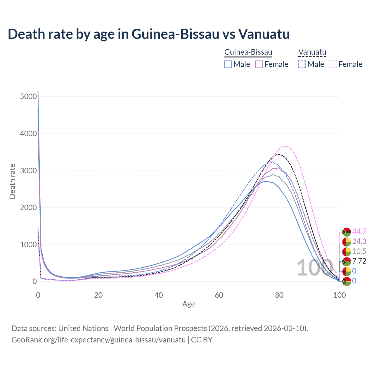 In Guinea-Bissau, the most common age of death is 0, compared to 80 in Vanuatu. The median age of death is 71.8 in Guinea-Bissau and 75.9 in Vanuatu, meaning only half of each cohort is expected to live past that age.