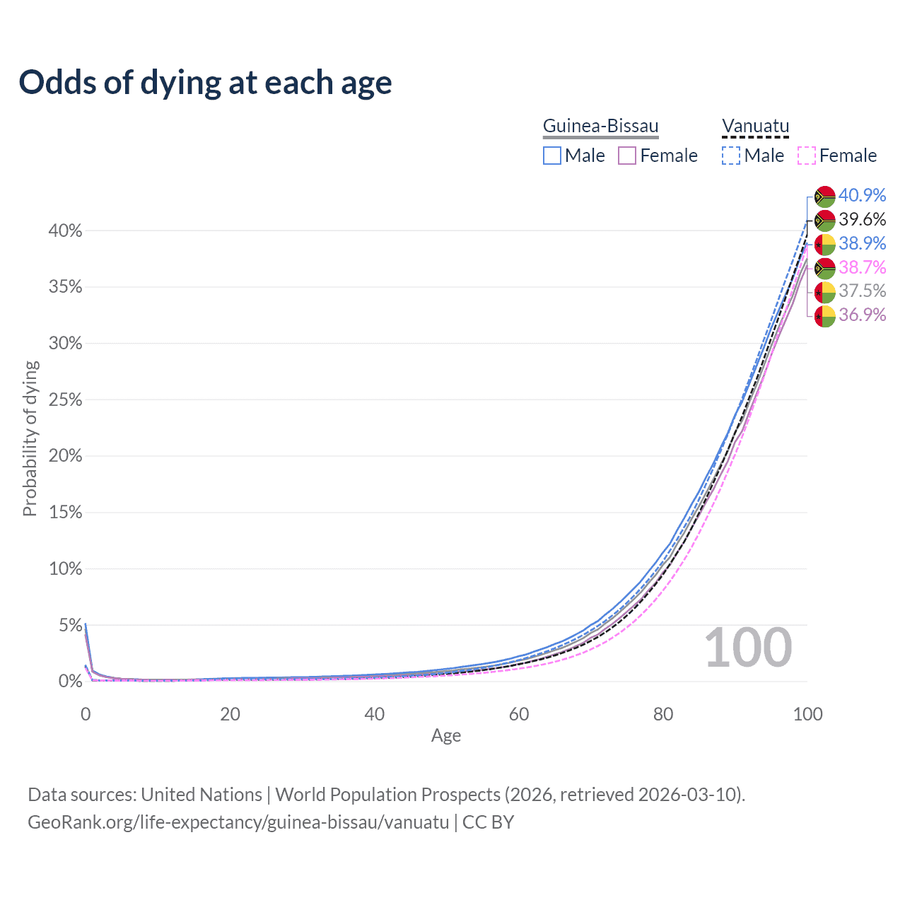This life expectancy calculator shows the odds of living to 100, 95, 90, and below based on current age for both males and females in Guinea-Bissau and Vanuatu, along with mean and median age of death. The calculations are based on the 2026 life tables (actuarial tables) from the UN World Population Prospects.