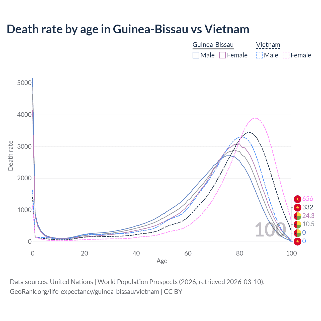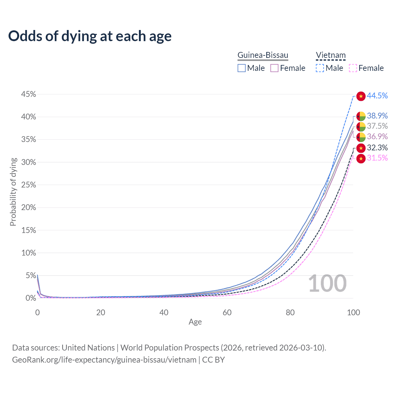 This life expectancy calculator shows the odds of living to 100, 95, 90, and below based on current age for both males and females in Guinea-Bissau and Vietnam, along with mean and median age of death. The calculations are based on the 2026 life tables (actuarial tables) from the UN World Population Prospects.