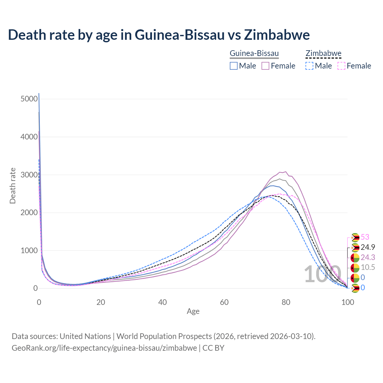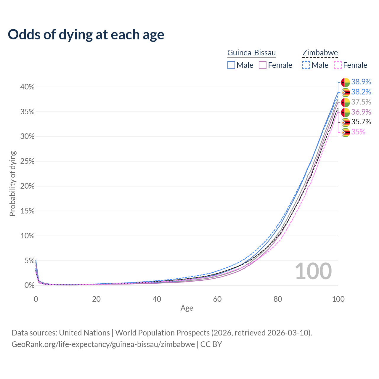 This life expectancy calculator shows the odds of living to 100, 95, 90, and below based on current age for both males and females in Guinea-Bissau and Zimbabwe, along with mean and median age of death. The calculations are based on the 2026 life tables (actuarial tables) from the UN World Population Prospects.