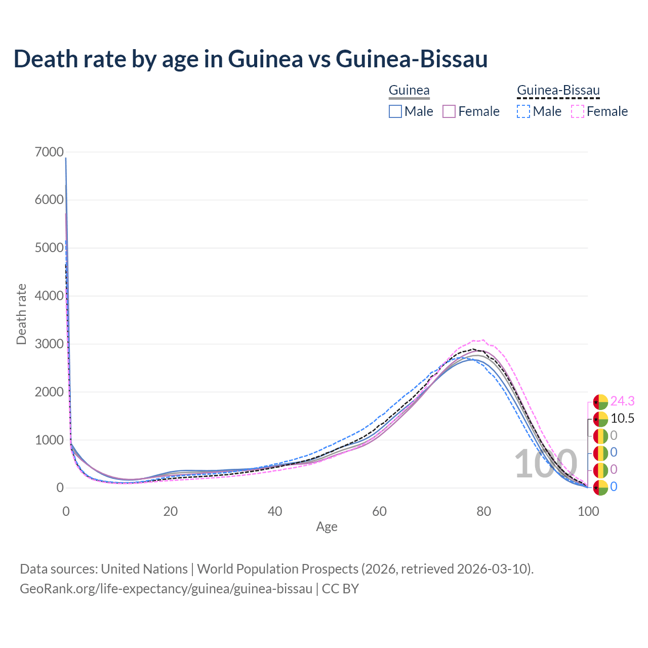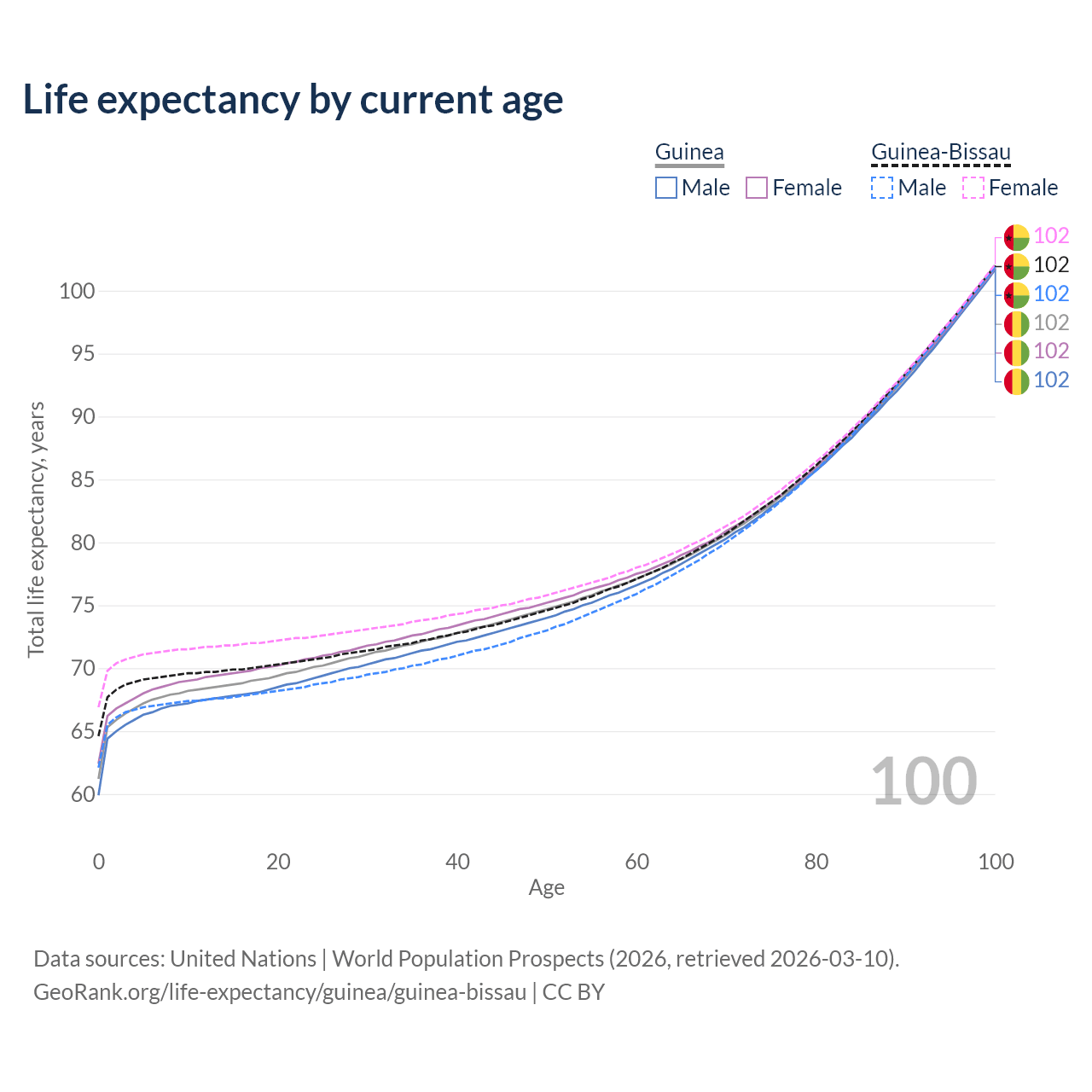 This life expectancy calculator shows the odds of living to 100, 95, 90, and below based on current age for both males and females in Guinea and Guinea-Bissau, along with mean and median age of death. The calculations are based on the 2026 life tables (actuarial tables) from the UN World Population Prospects.