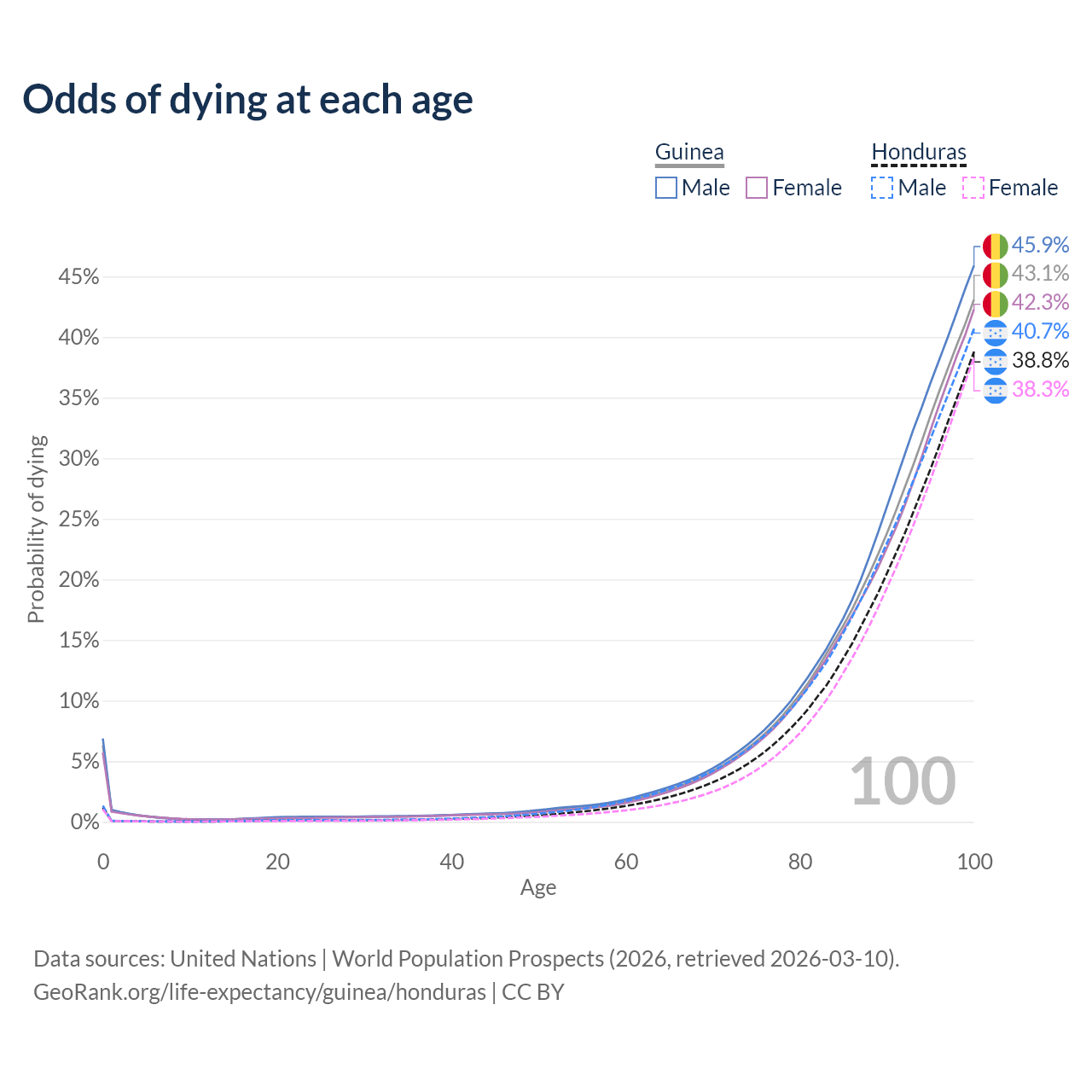 This life expectancy calculator shows the odds of living to 100, 95, 90, and below based on current age for both males and females in Guinea and Honduras, along with mean and median age of death. The calculations are based on the 2026 life tables (actuarial tables) from the UN World Population Prospects.