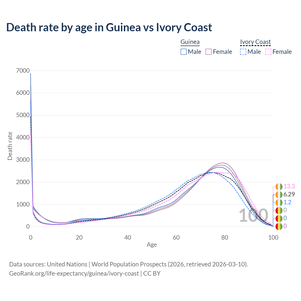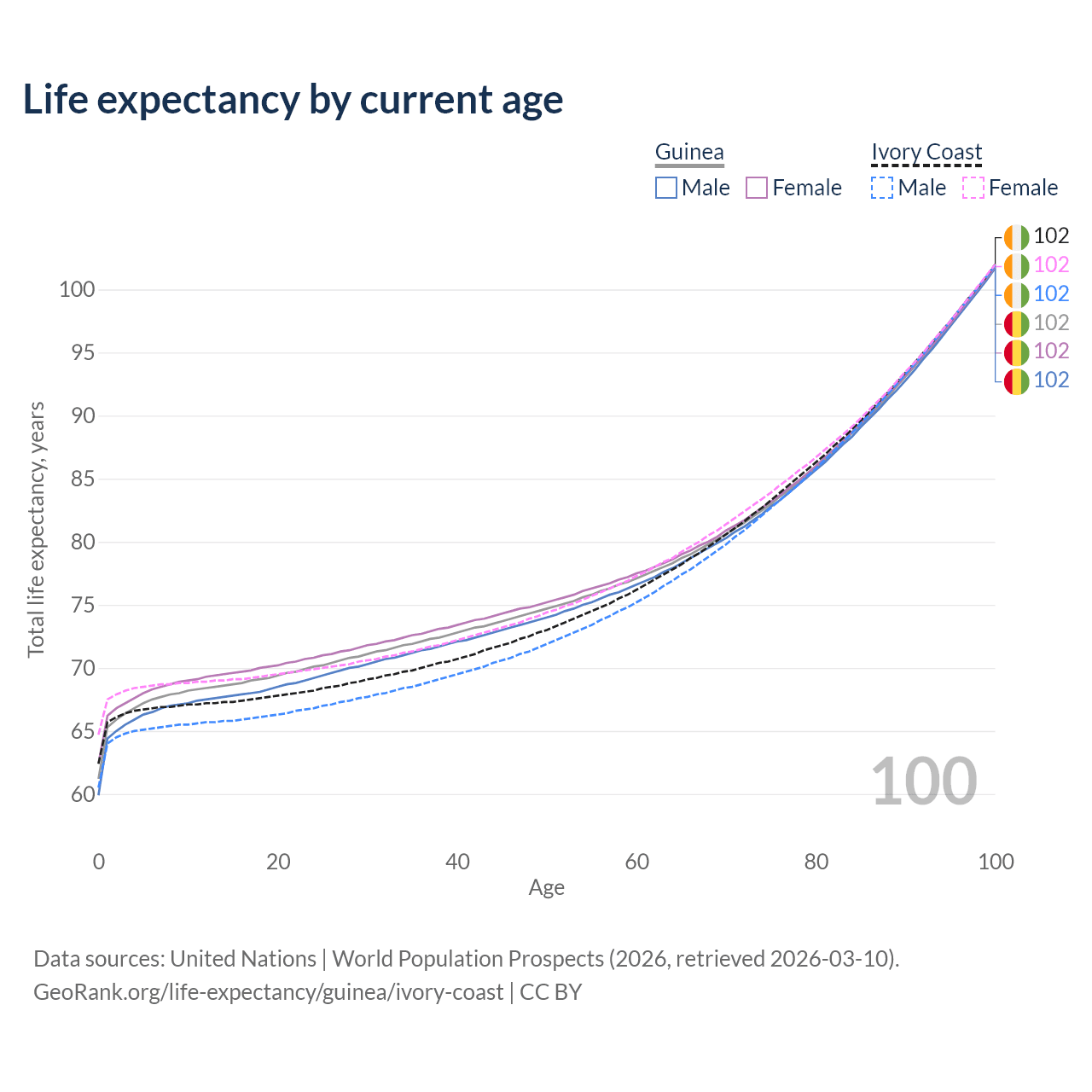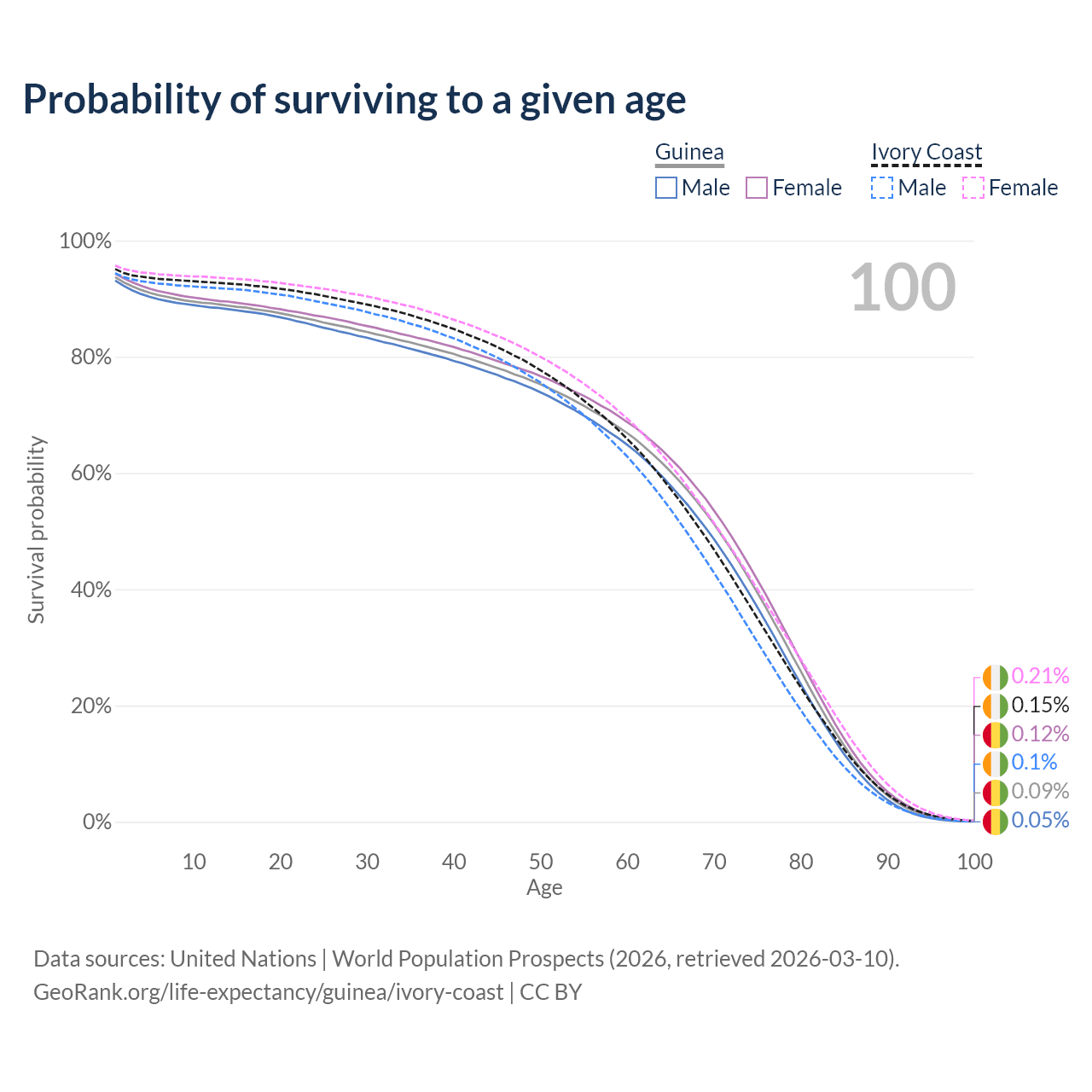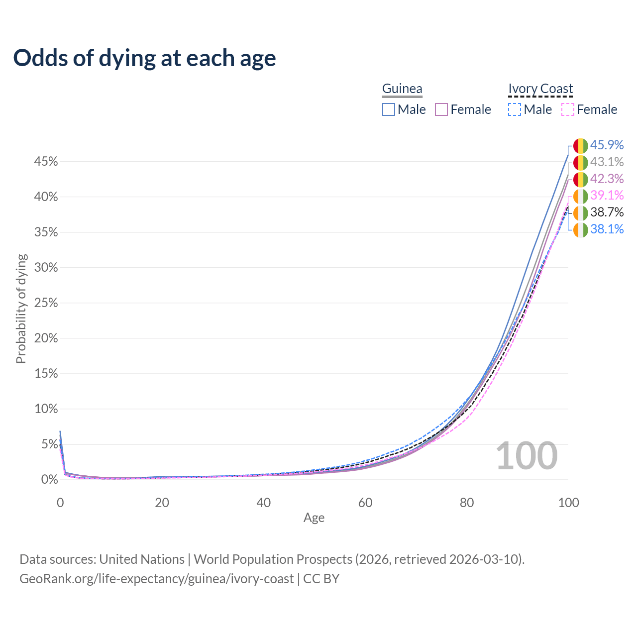 This life expectancy calculator shows the odds of living to 100, 95, 90, and below based on current age for both males and females in Guinea and Ivory Coast, along with mean and median age of death. The calculations are based on the 2026 life tables (actuarial tables) from the UN World Population Prospects.