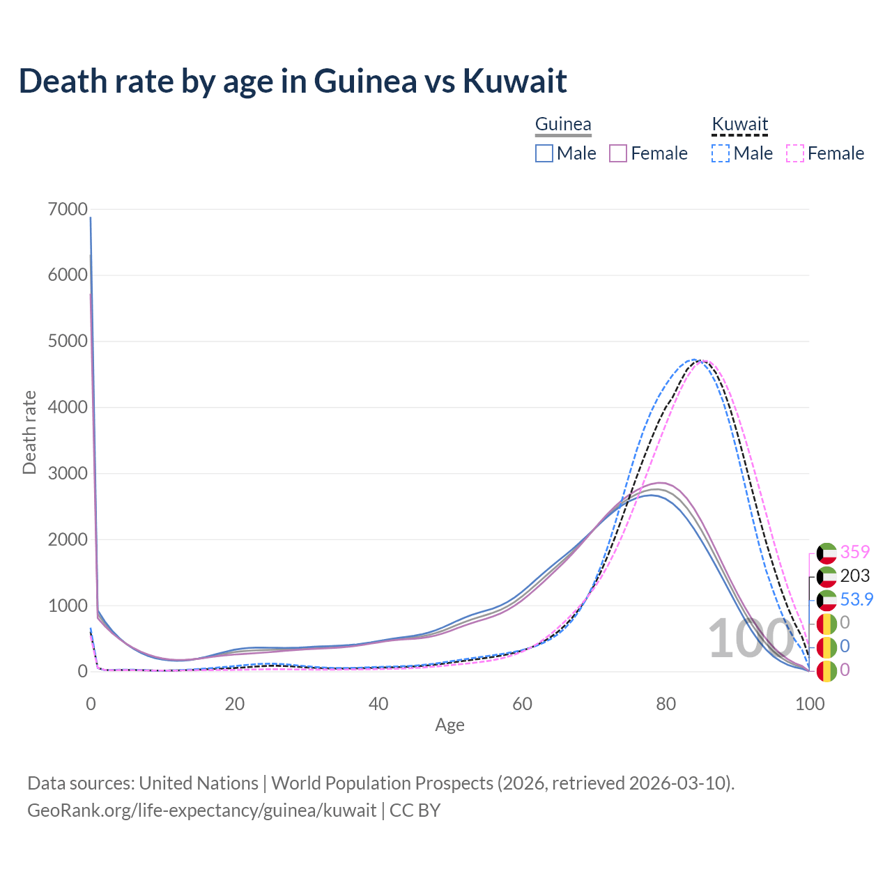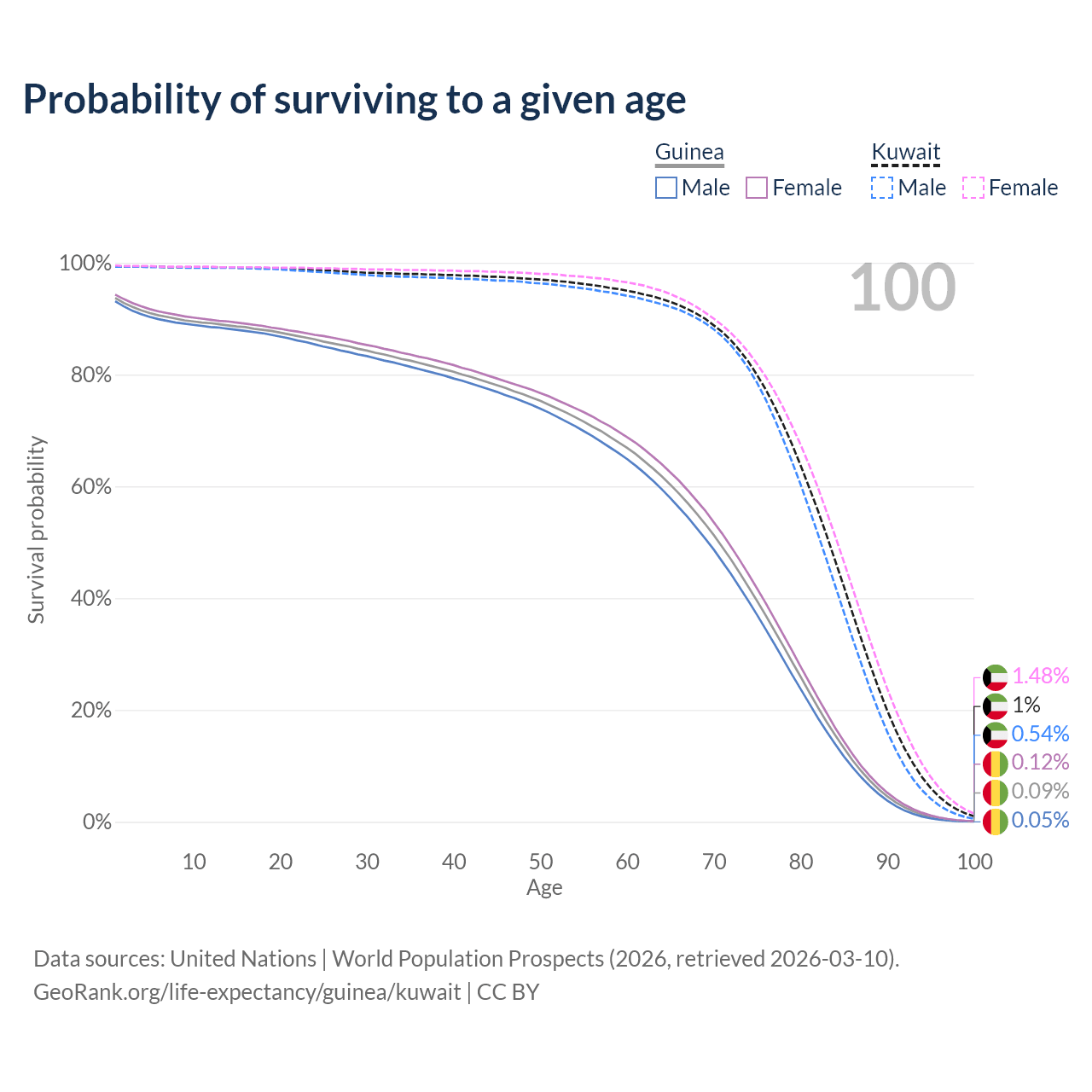 This life expectancy calculator shows the odds of living to 100, 95, 90, and below based on current age for both males and females in Guinea and Kuwait, along with mean and median age of death. The calculations are based on the 2026 life tables (actuarial tables) from the UN World Population Prospects.