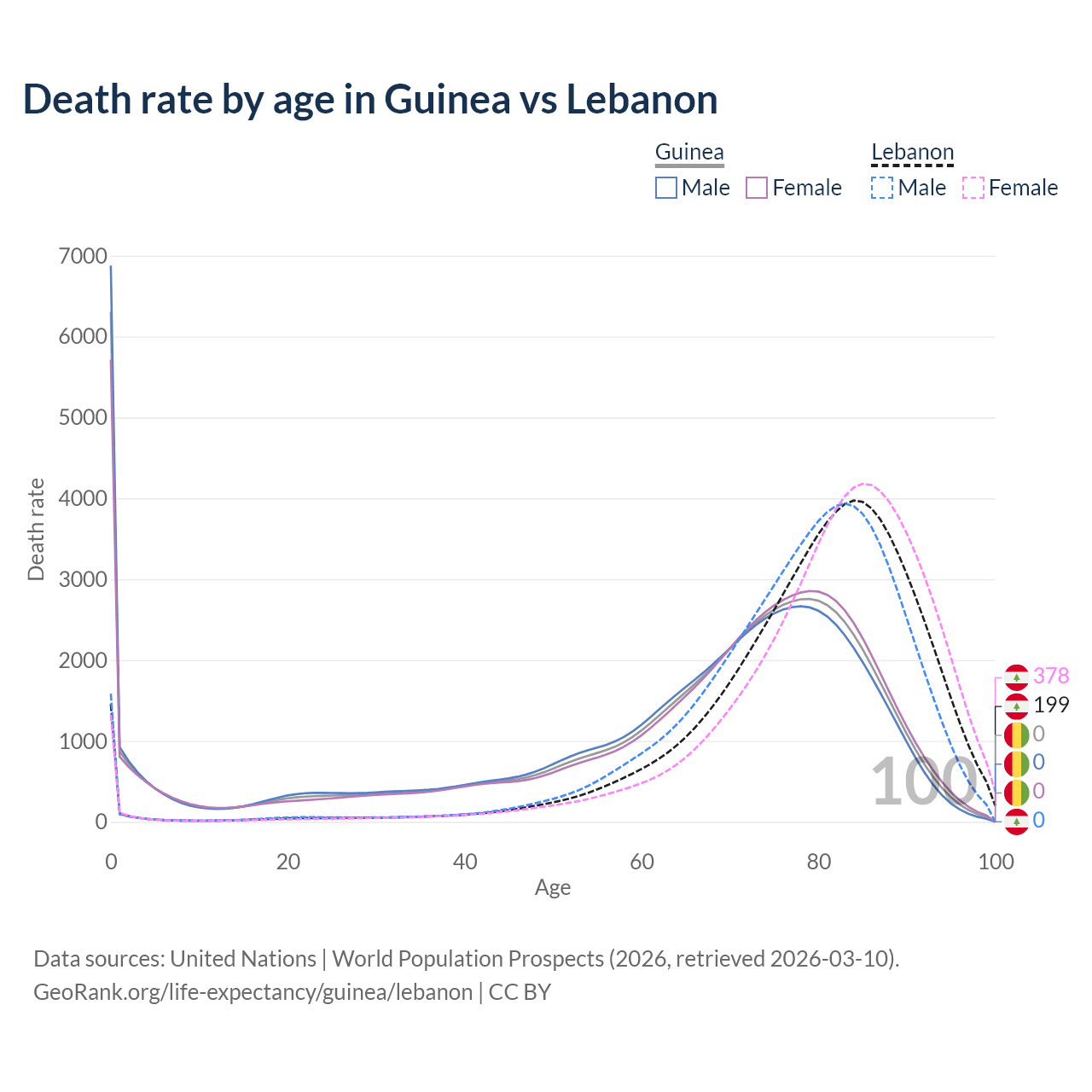In Guinea, the most common age of death is 0, compared to 84 in Lebanon. The median age of death is 70.6 in Guinea and 81.6 in Lebanon, meaning only half of each cohort is expected to live past that age.
