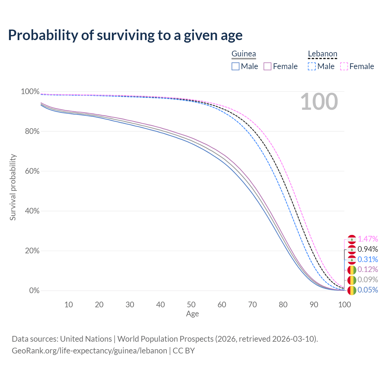 This life expectancy calculator shows the odds of living to 100, 95, 90, and below based on current age for both males and females in Guinea and Lebanon, along with mean and median age of death. The calculations are based on the 2026 life tables (actuarial tables) from the UN World Population Prospects.