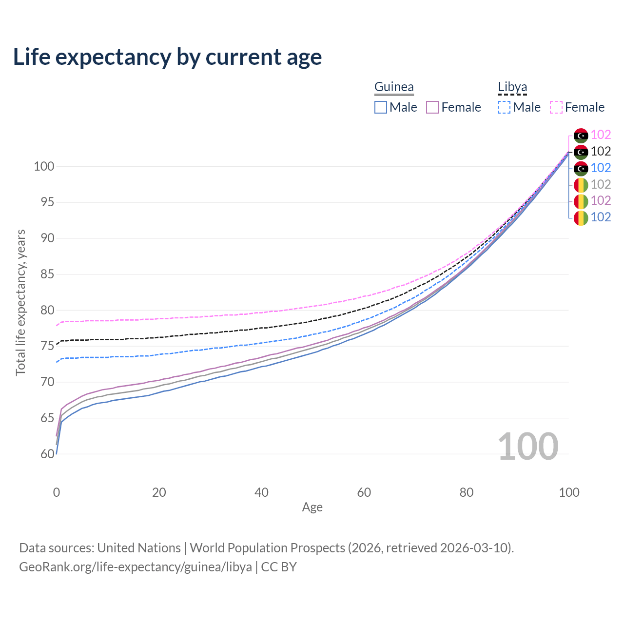This life expectancy calculator shows the odds of living to 100, 95, 90, and below based on current age for both males and females in Guinea and Libya, along with mean and median age of death. The calculations are based on the 2026 life tables (actuarial tables) from the UN World Population Prospects.