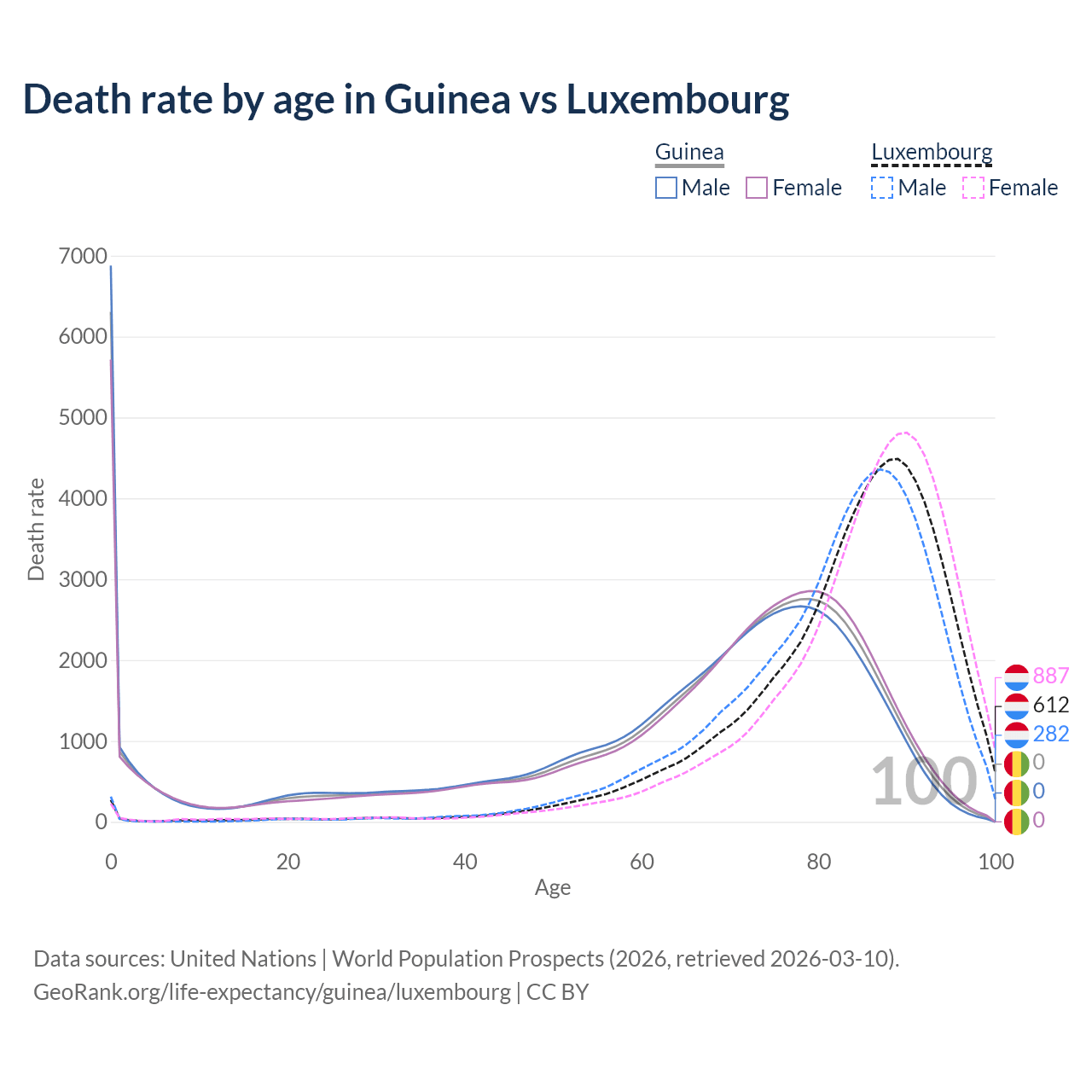 In Guinea, the most common age of death is 0, compared to 89 in Luxembourg. The median age of death is 70.6 in Guinea and 85.7 in Luxembourg, meaning only half of each cohort is expected to live past that age.
