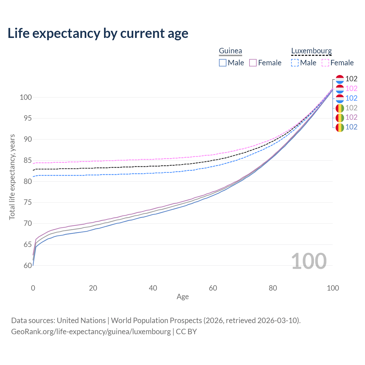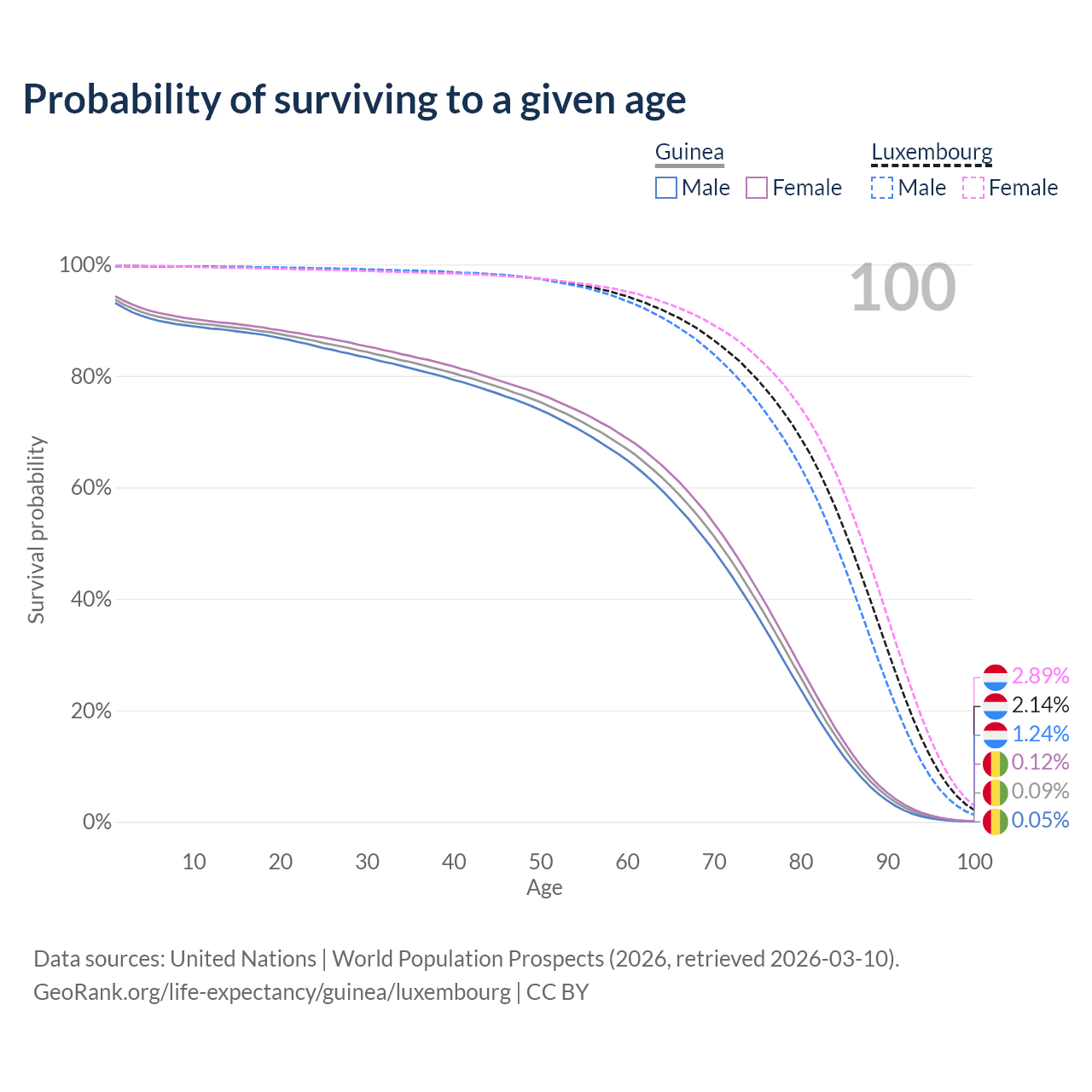 This life expectancy calculator shows the odds of living to 100, 95, 90, and below based on current age for both males and females in Guinea and Luxembourg, along with mean and median age of death. The calculations are based on the 2026 life tables (actuarial tables) from the UN World Population Prospects.
