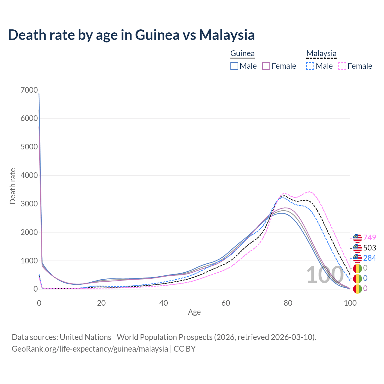 In Guinea, the most common age of death is 0, compared to 79 in Malaysia. The median age of death is 70.6 in Guinea and 79.8 in Malaysia, meaning only half of each cohort is expected to live past that age.