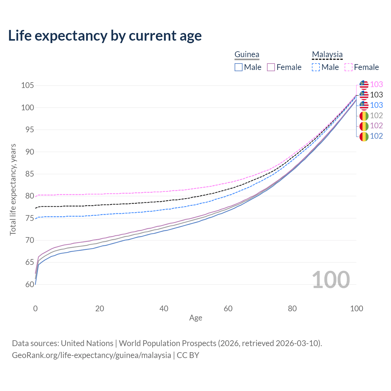 This life expectancy calculator shows the odds of living to 100, 95, 90, and below based on current age for both males and females in Guinea and Malaysia, along with mean and median age of death. The calculations are based on the 2026 life tables (actuarial tables) from the UN World Population Prospects.