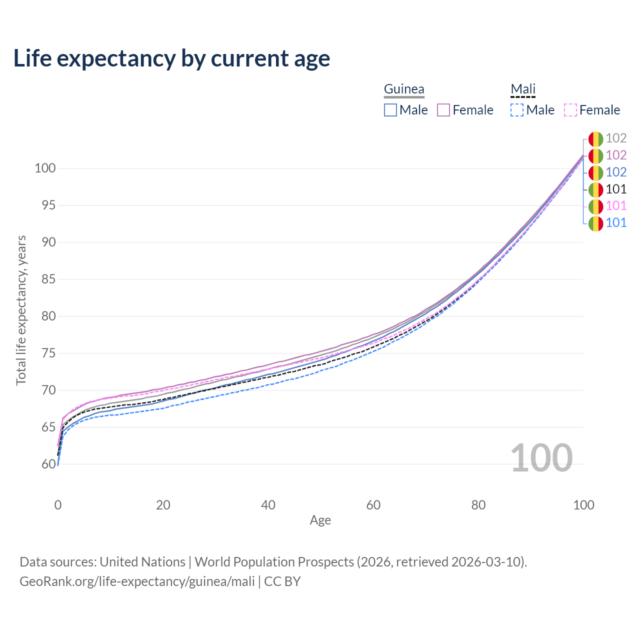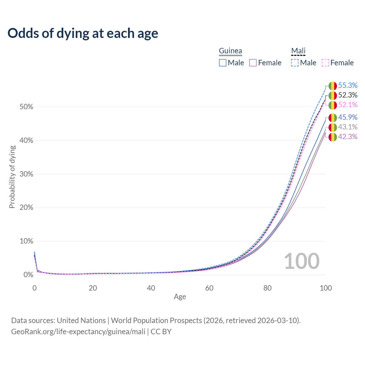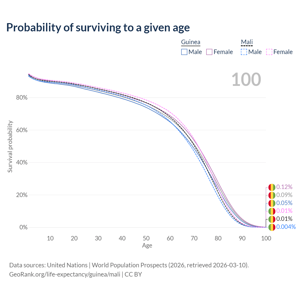 This life expectancy calculator shows the odds of living to 100, 95, 90, and below based on current age for both males and females in Guinea and Mali, along with mean and median age of death. The calculations are based on the 2026 life tables (actuarial tables) from the UN World Population Prospects.