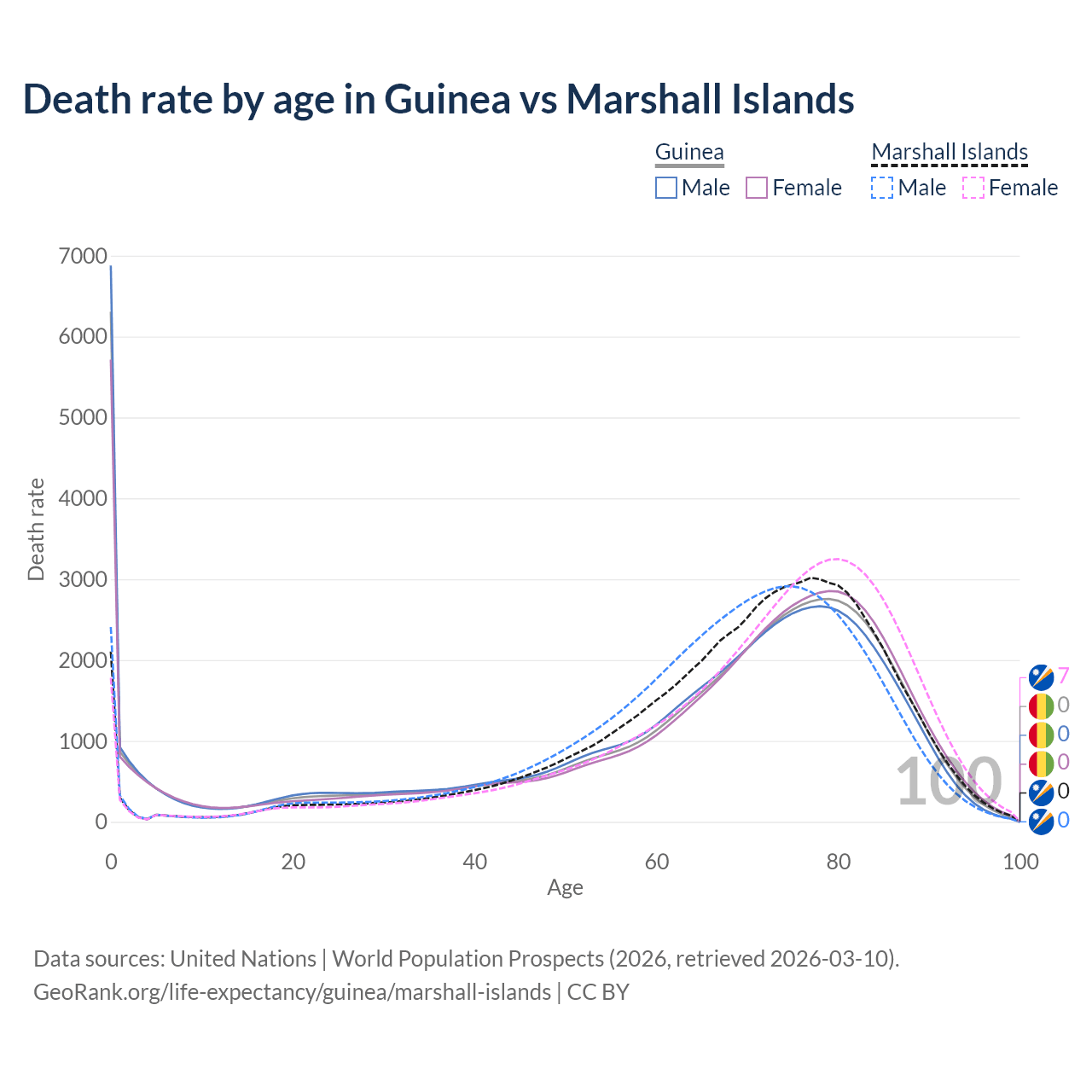 In Guinea, the most common age of death is 0, compared to 77 in the Marshall Islands. The median age of death is 70.6 in Guinea and 72 in the Marshall Islands, meaning only half of each cohort is expected to live past that age.