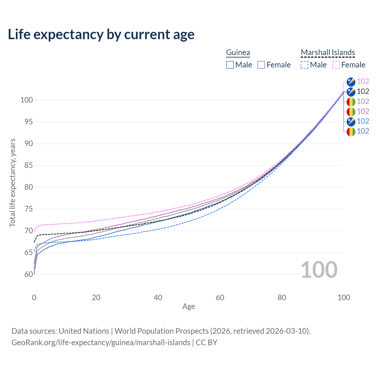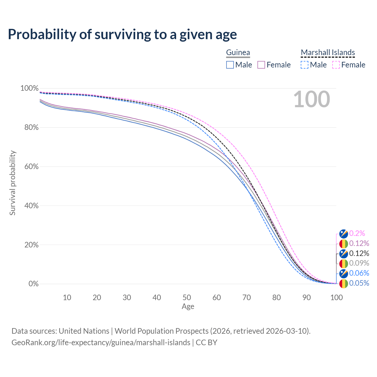 This life expectancy calculator shows the odds of living to 100, 95, 90, and below based on current age for both males and females in Guinea and the Marshall Islands, along with mean and median age of death. The calculations are based on the 2026 life tables (actuarial tables) from the UN World Population Prospects.