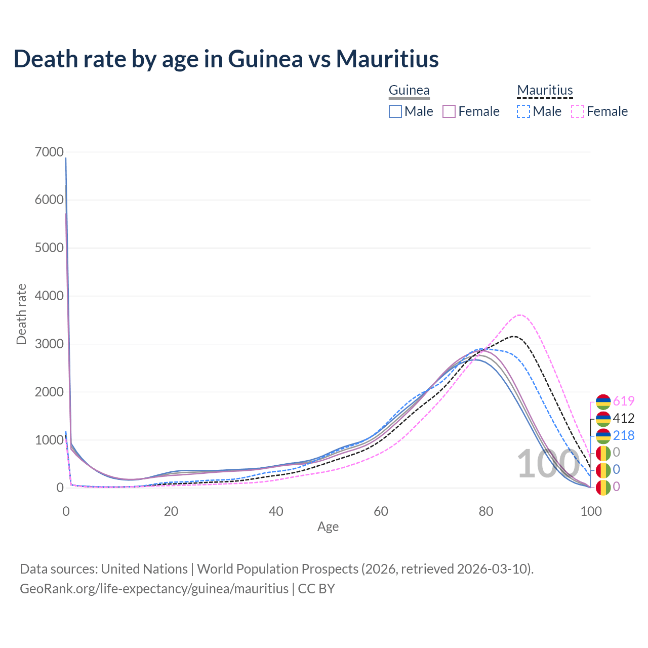 In Guinea, the most common age of death is 0, compared to 85 in Mauritius. The median age of death is 70.6 in Guinea and 79.1 in Mauritius, meaning only half of each cohort is expected to live past that age.