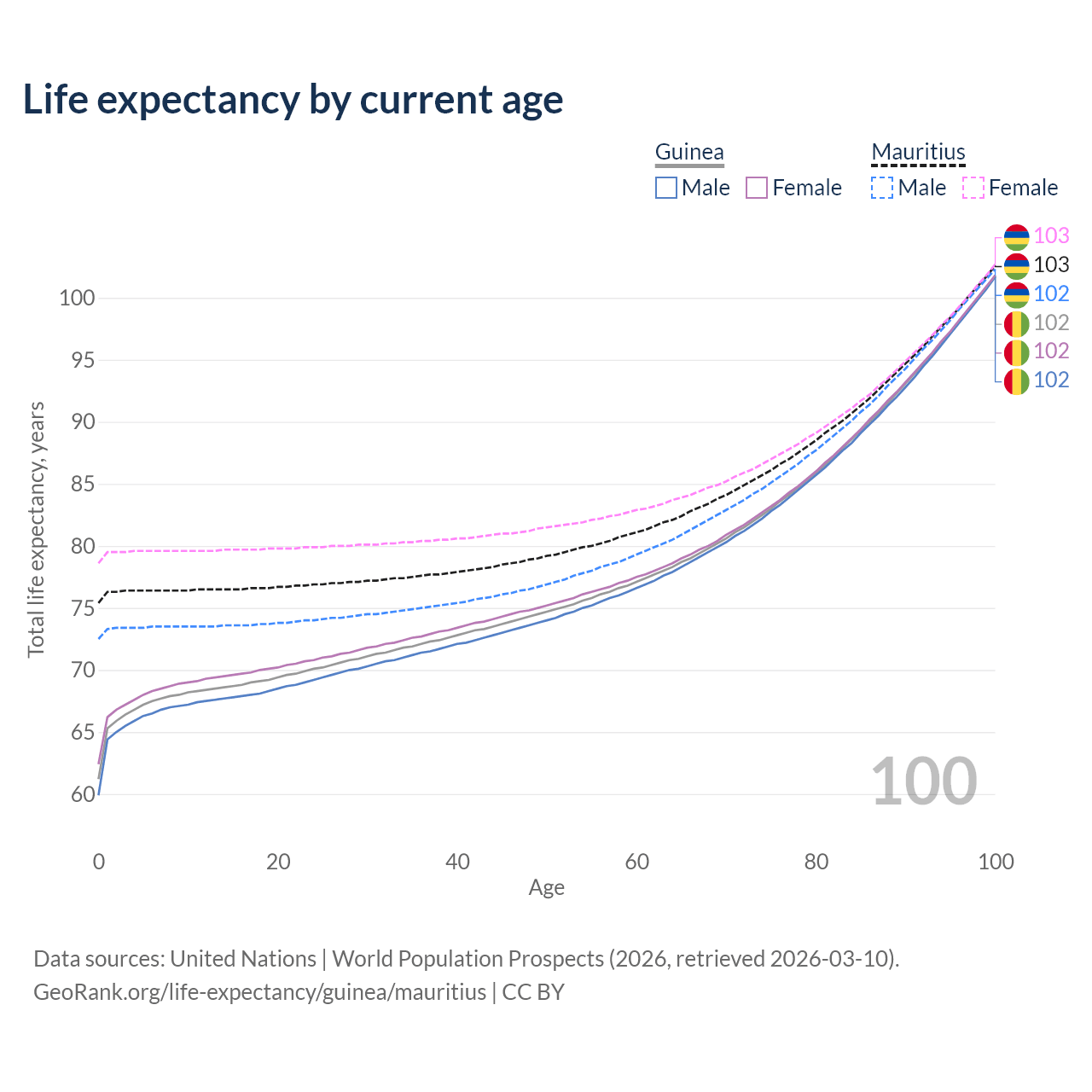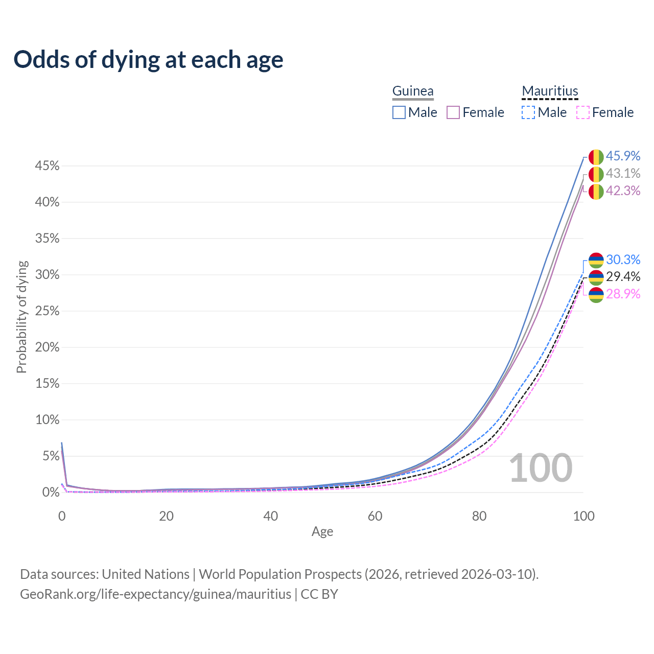 This life expectancy calculator shows the odds of living to 100, 95, 90, and below based on current age for both males and females in Guinea and Mauritius, along with mean and median age of death. The calculations are based on the 2026 life tables (actuarial tables) from the UN World Population Prospects.