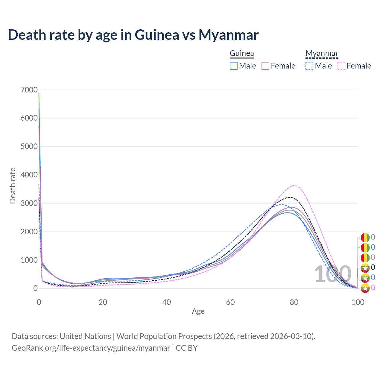 In Guinea, the most common age of death is 0, compared to 79 in Myanmar. The median age of death is 70.6 in Guinea and 73.1 in Myanmar, meaning only half of each cohort is expected to live past that age.