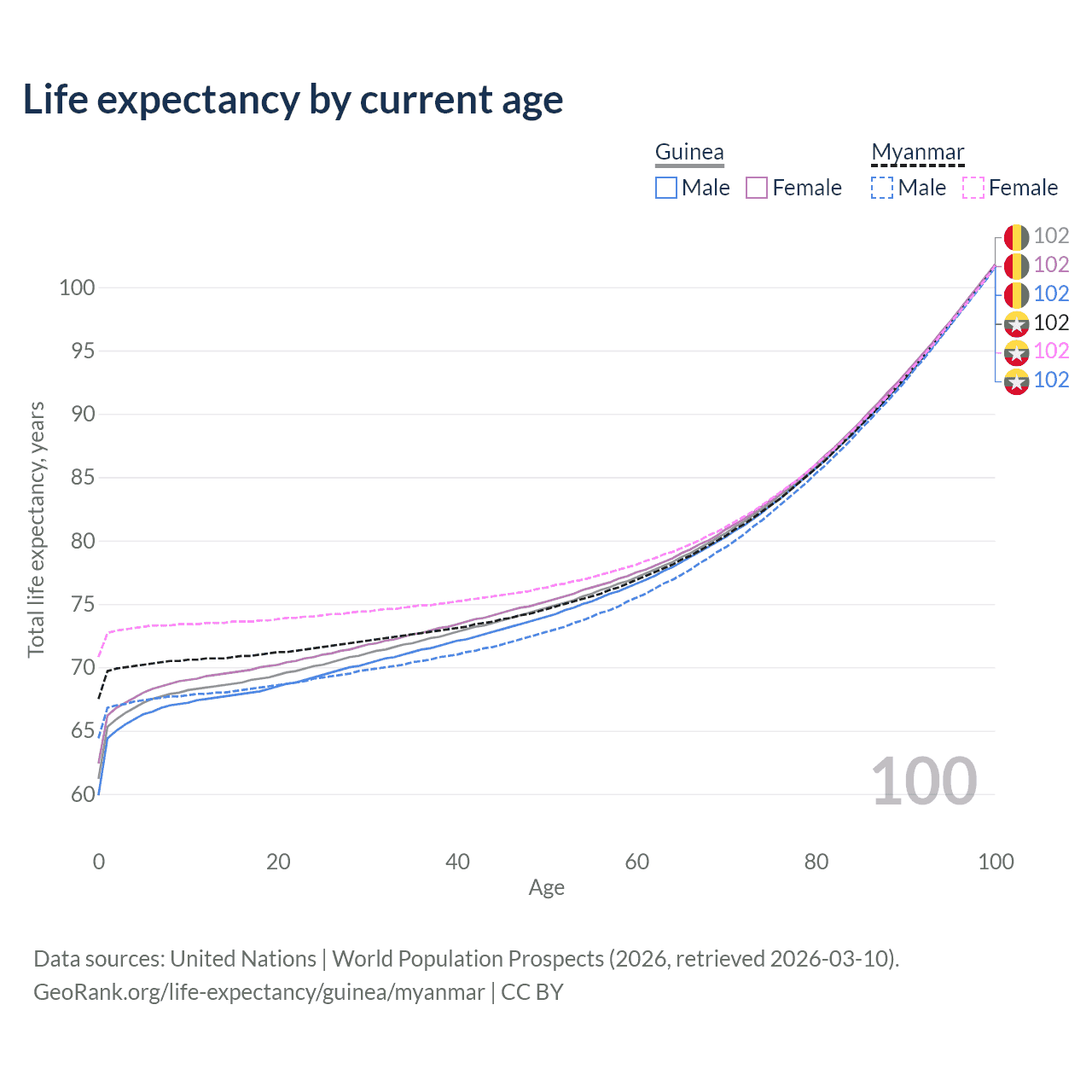 This life expectancy calculator shows the odds of living to 100, 95, 90, and below based on current age for both males and females in Guinea and Myanmar, along with mean and median age of death. The calculations are based on the 2026 life tables (actuarial tables) from the UN World Population Prospects.