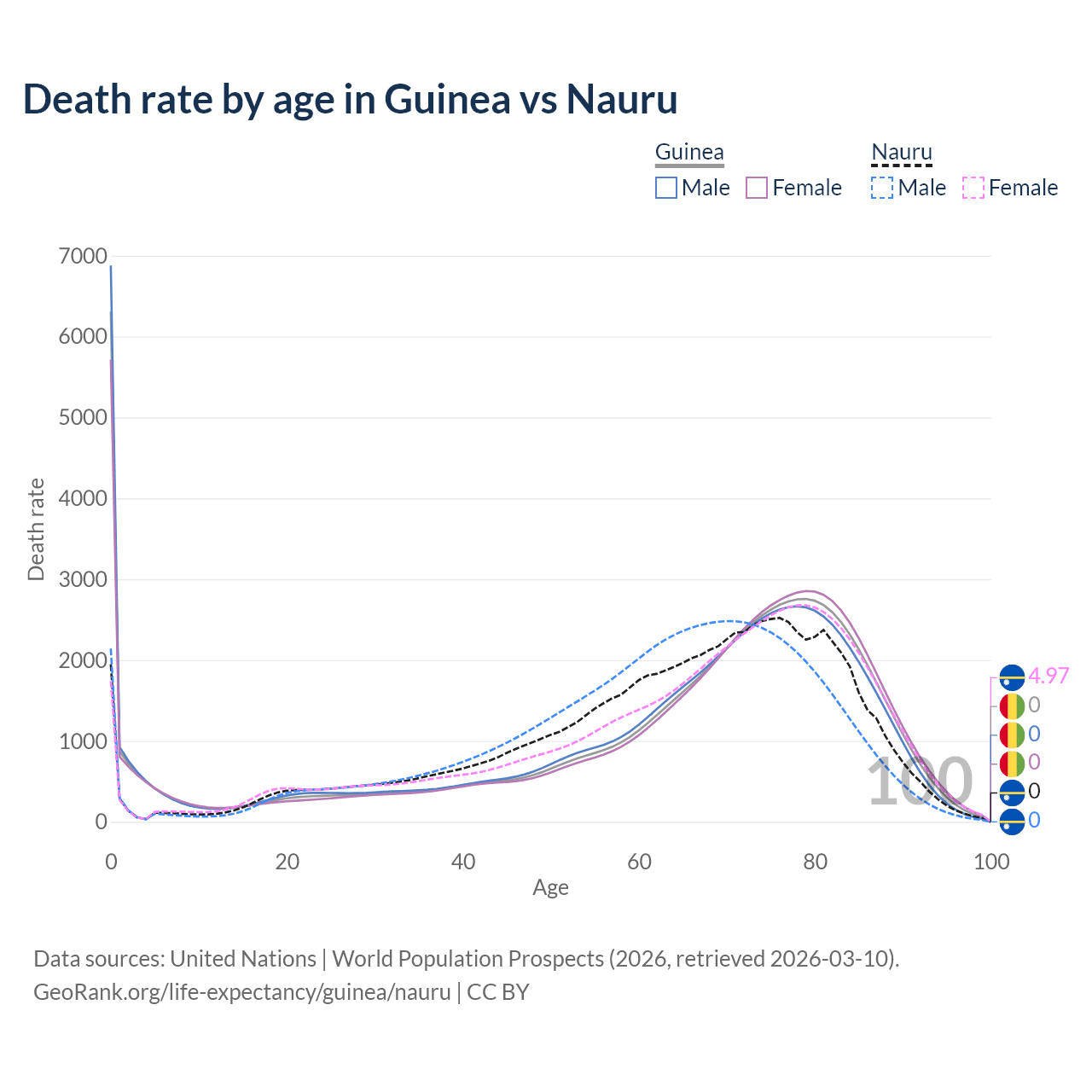 In Guinea, the most common age of death is 0, compared to 76 in Nauru. The median age of death is 70.6 in Guinea and 67.3 in Nauru, meaning only half of each cohort is expected to live past that age.